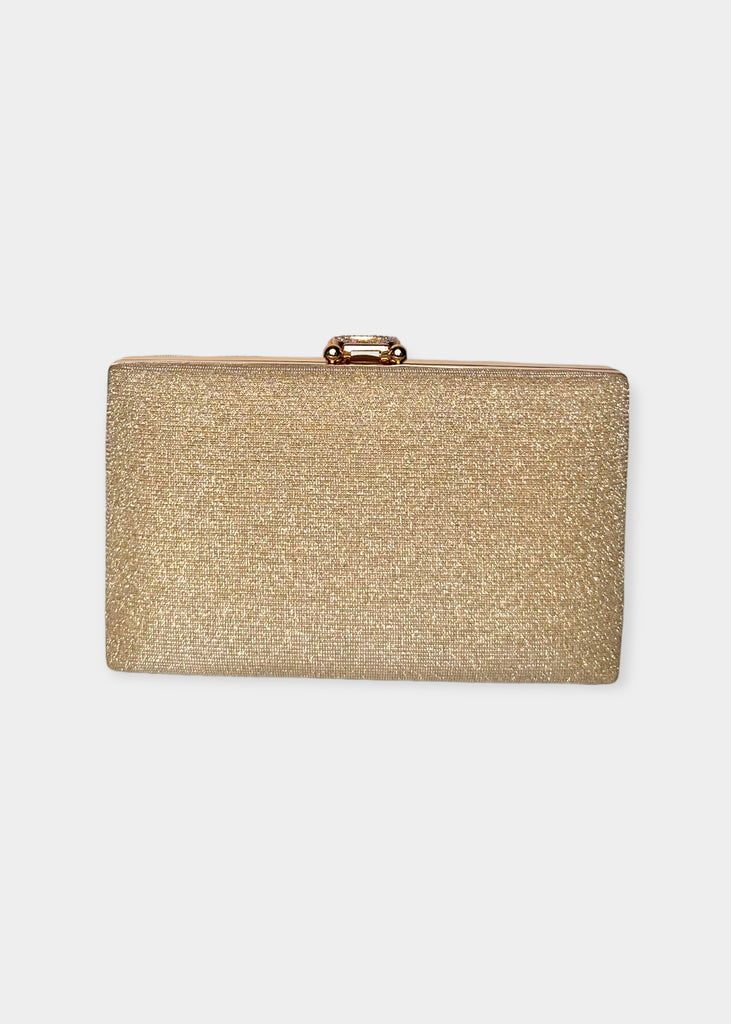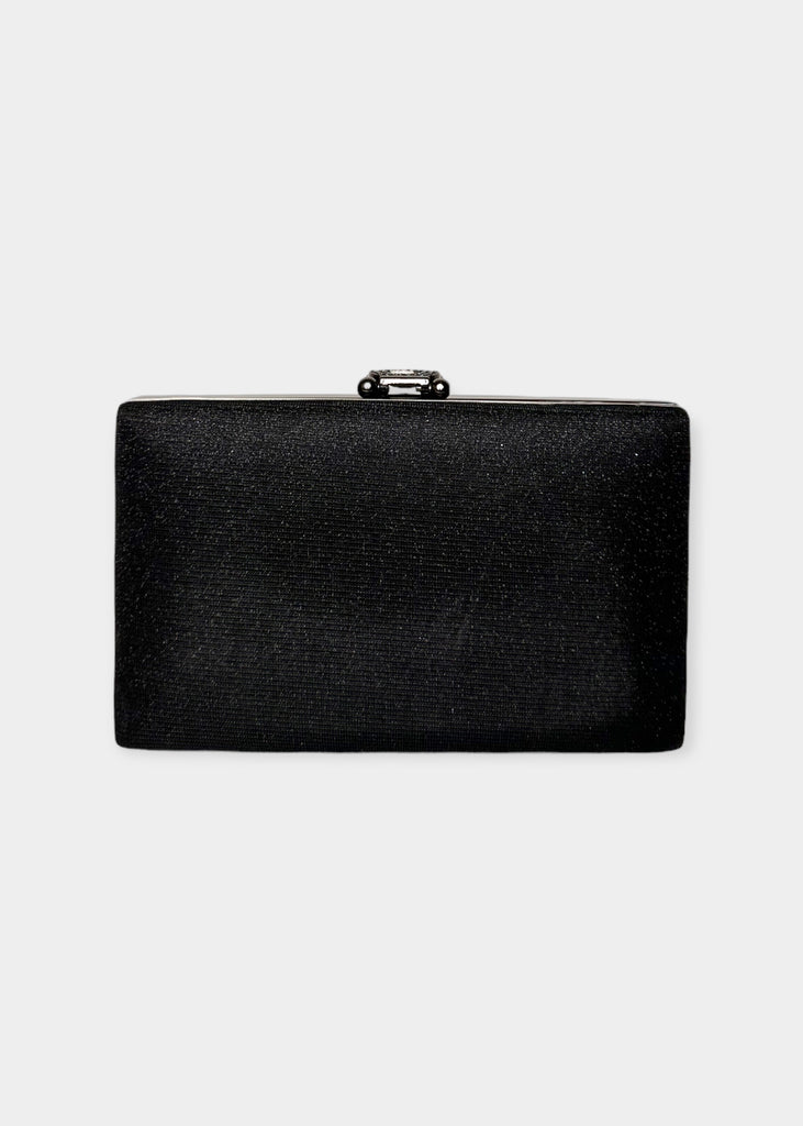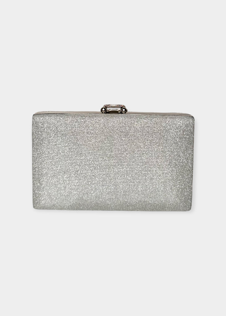 Borsa clutch glitter con chiusura a clip e gancio gioiello. Catena a tracolla rimovibile.