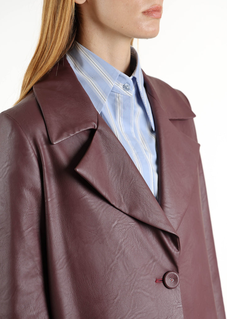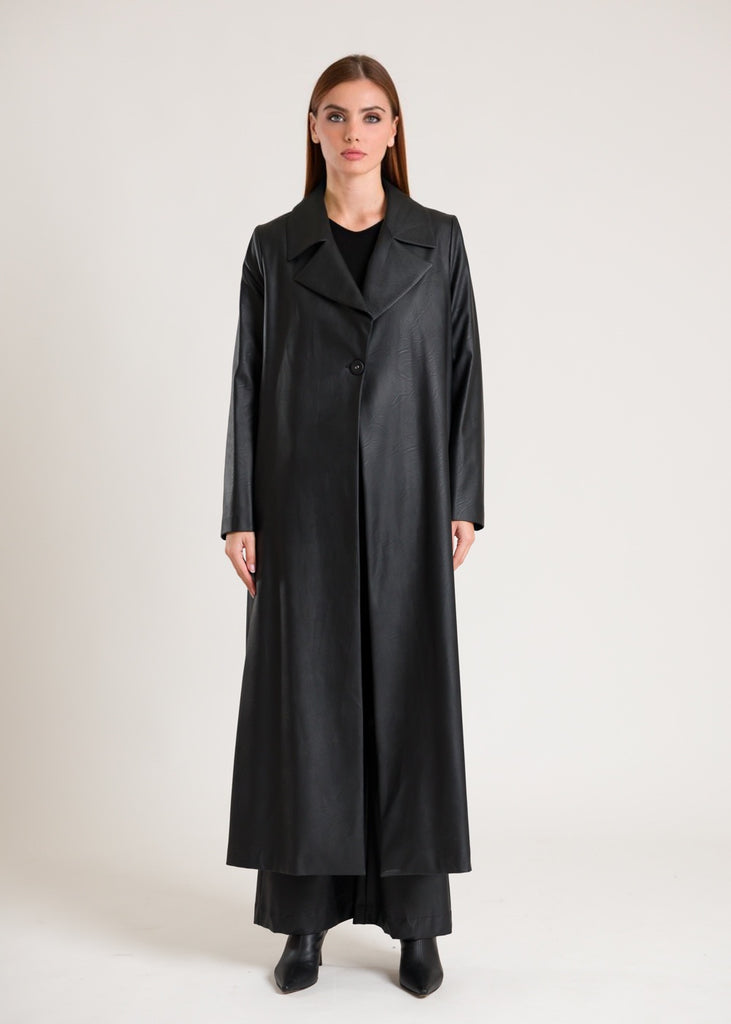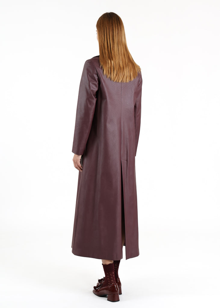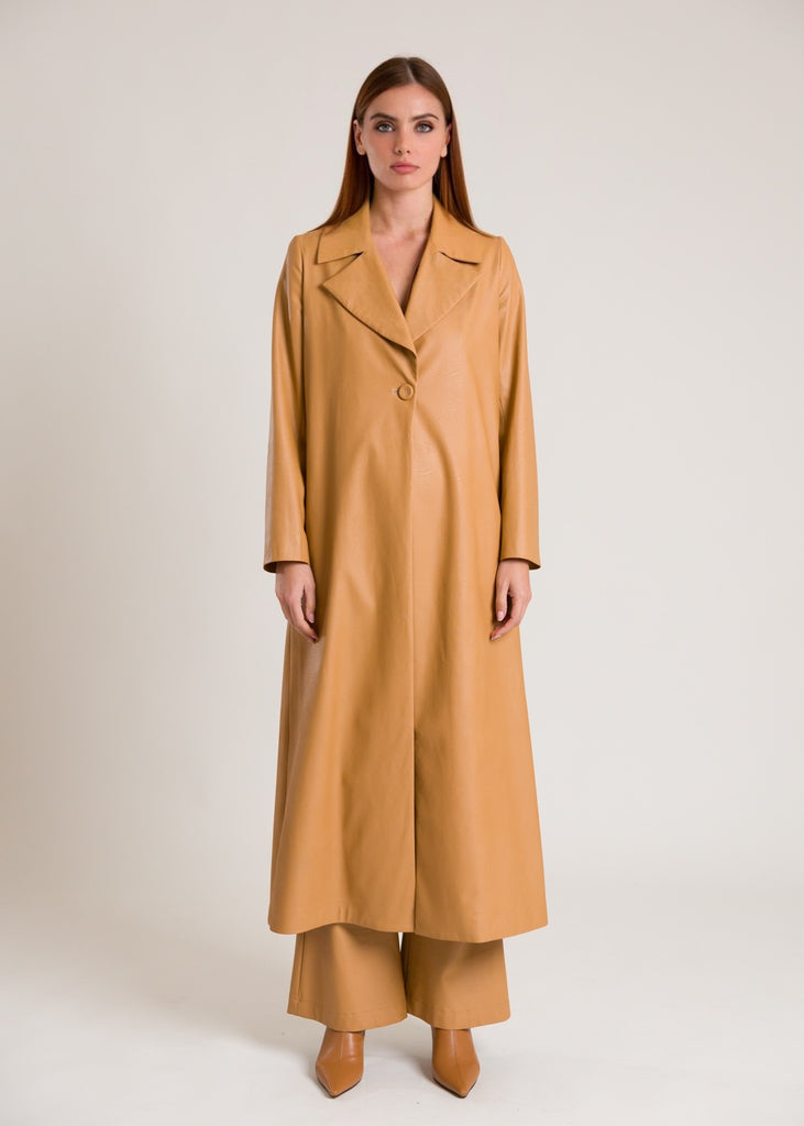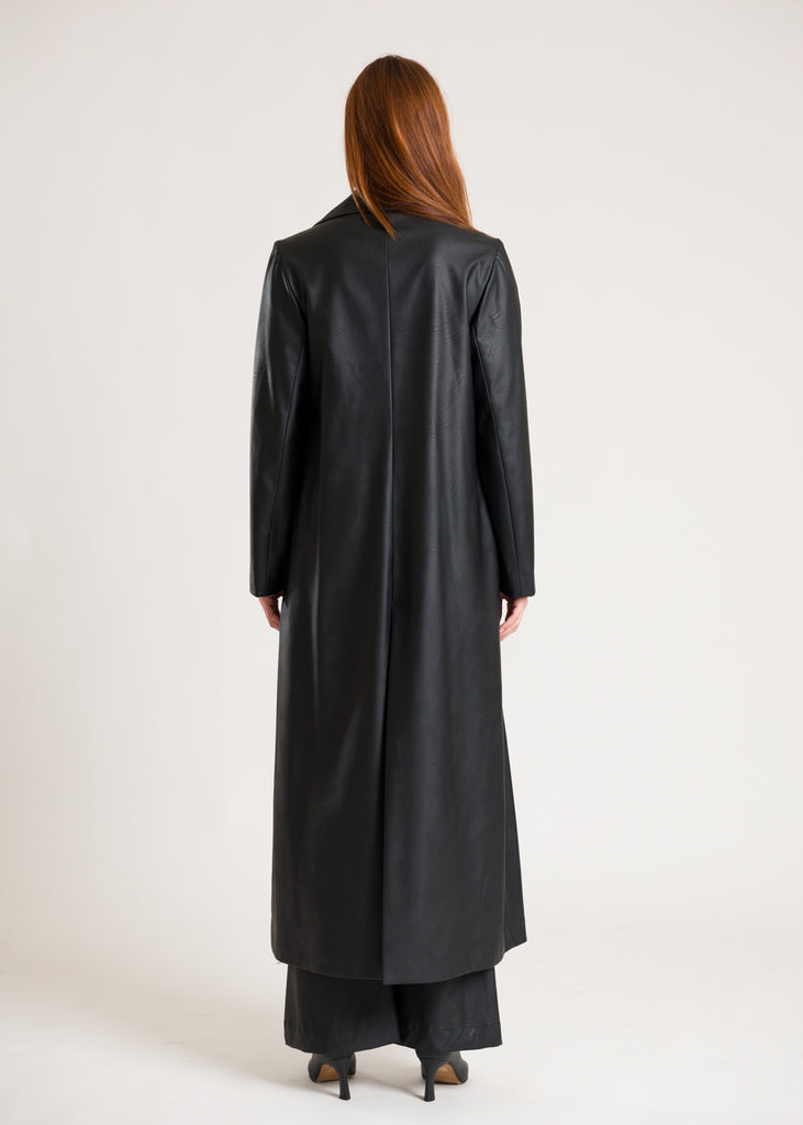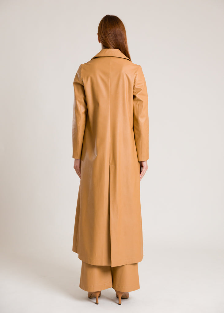 Cappotto lungo in pelle vegana realizzato in materiali completamente di origine vegetale.