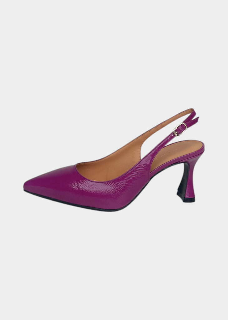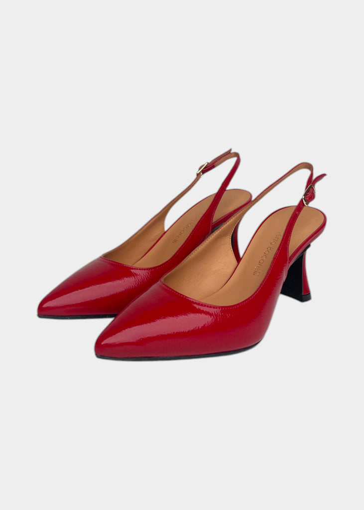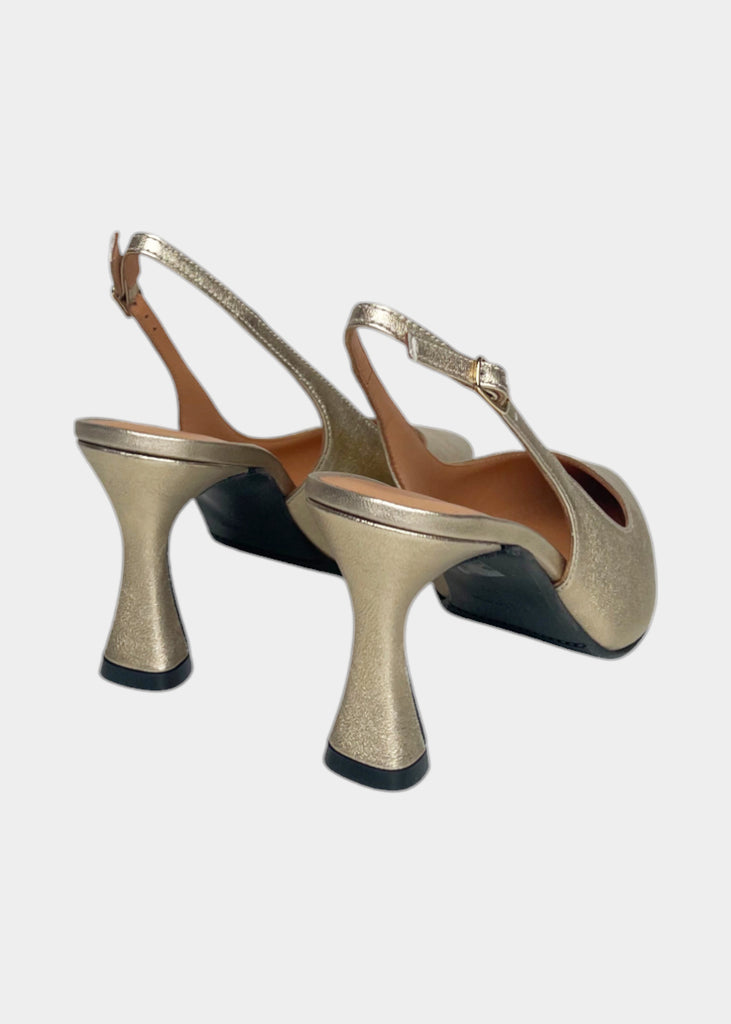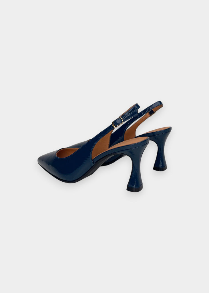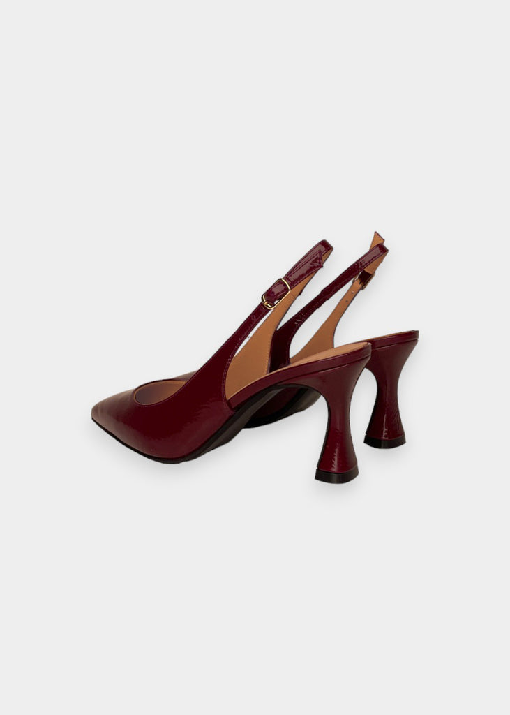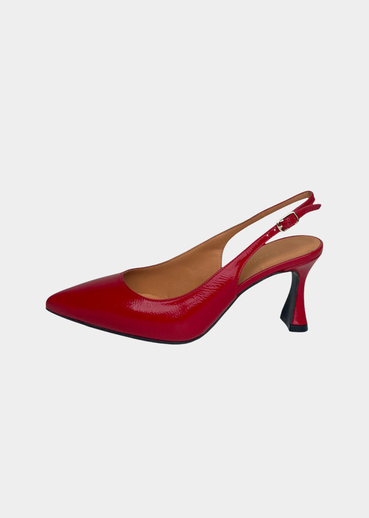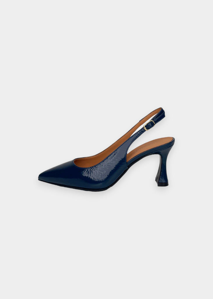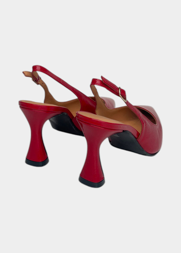 Decolletè con cinturino regolabile e tacco a rocchetto alto 8cm.