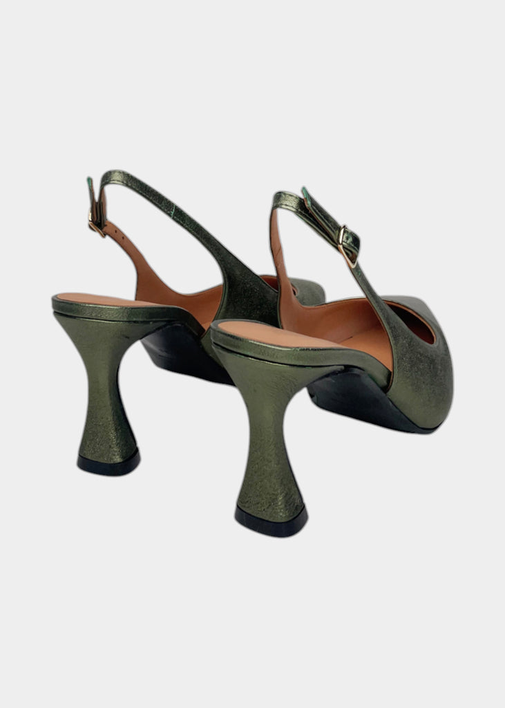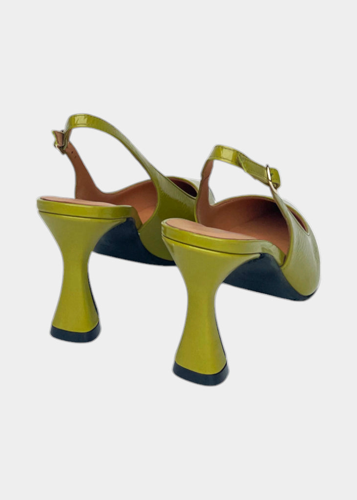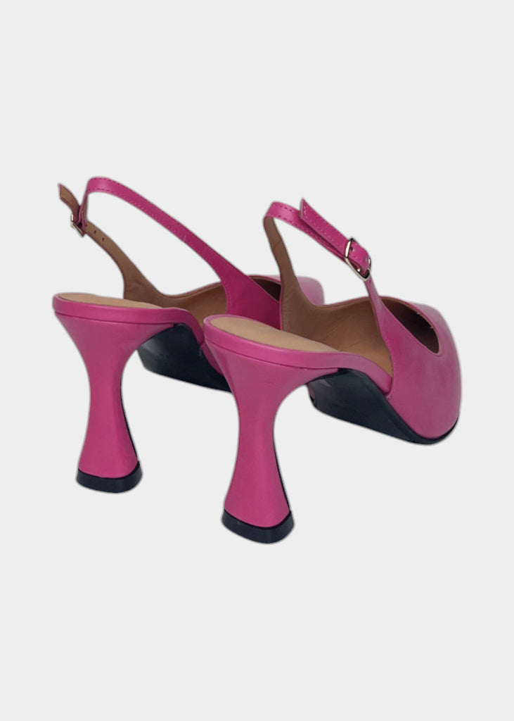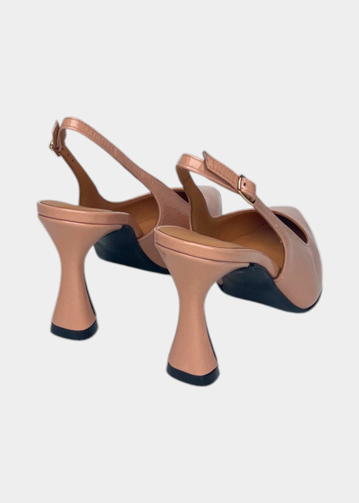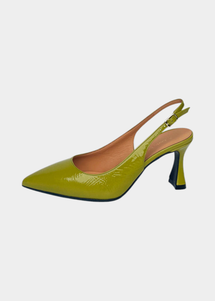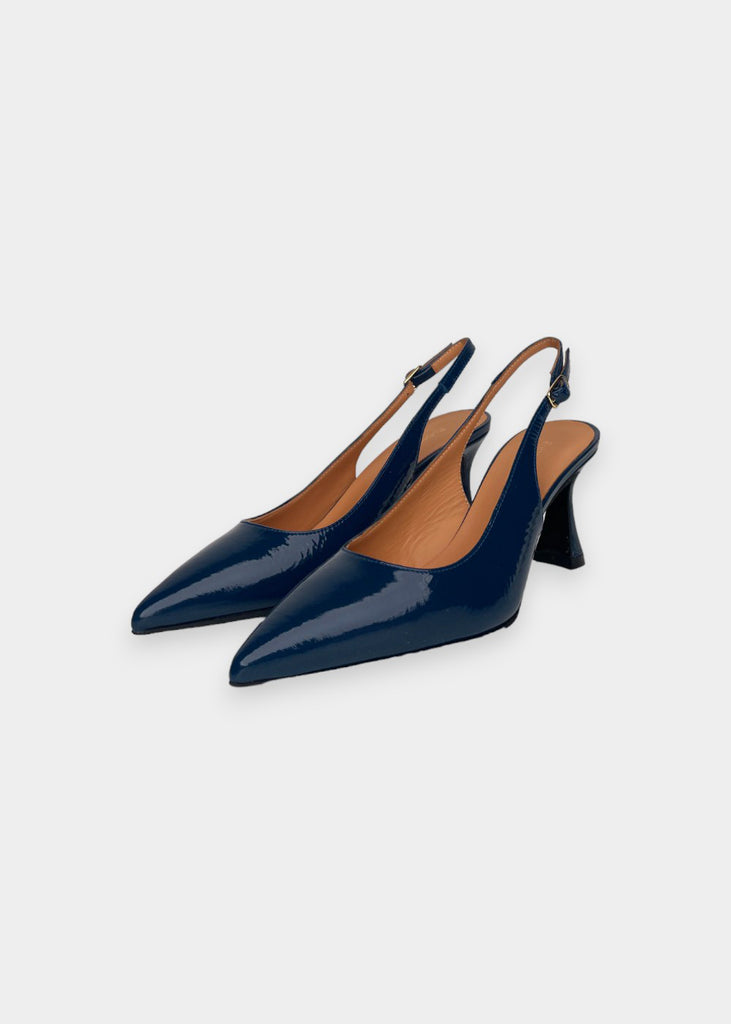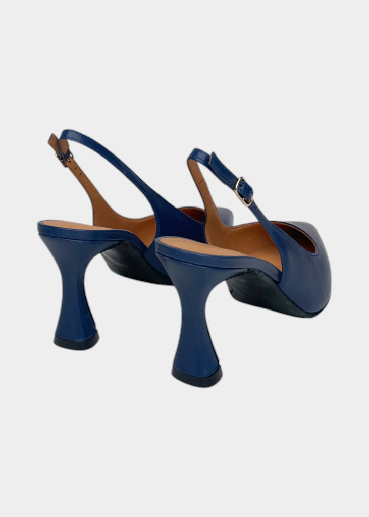 Decolletè con cinturino regolabile e tacco a rocchetto alto 8cm.