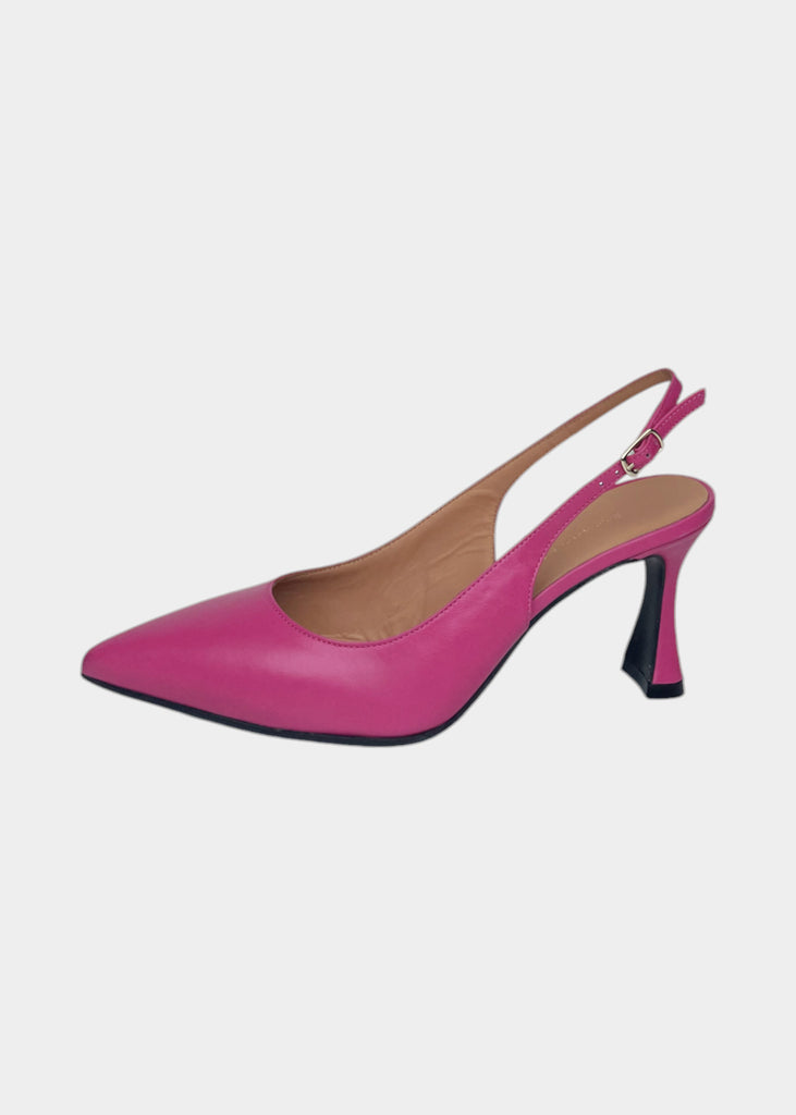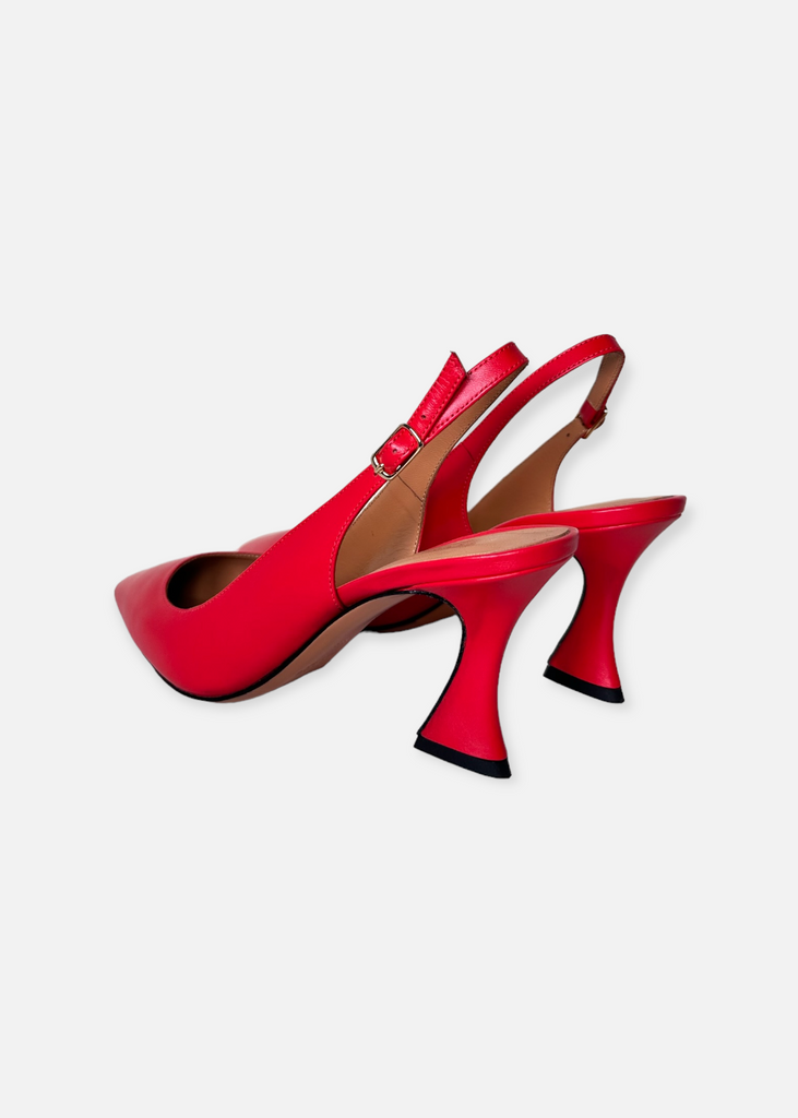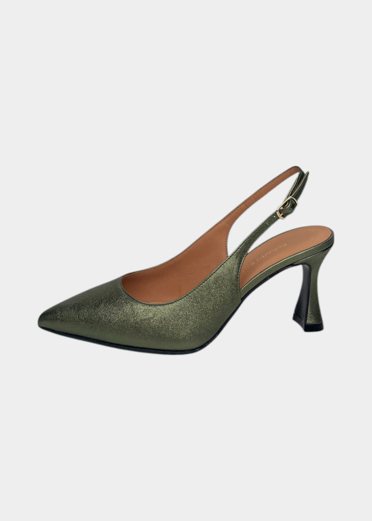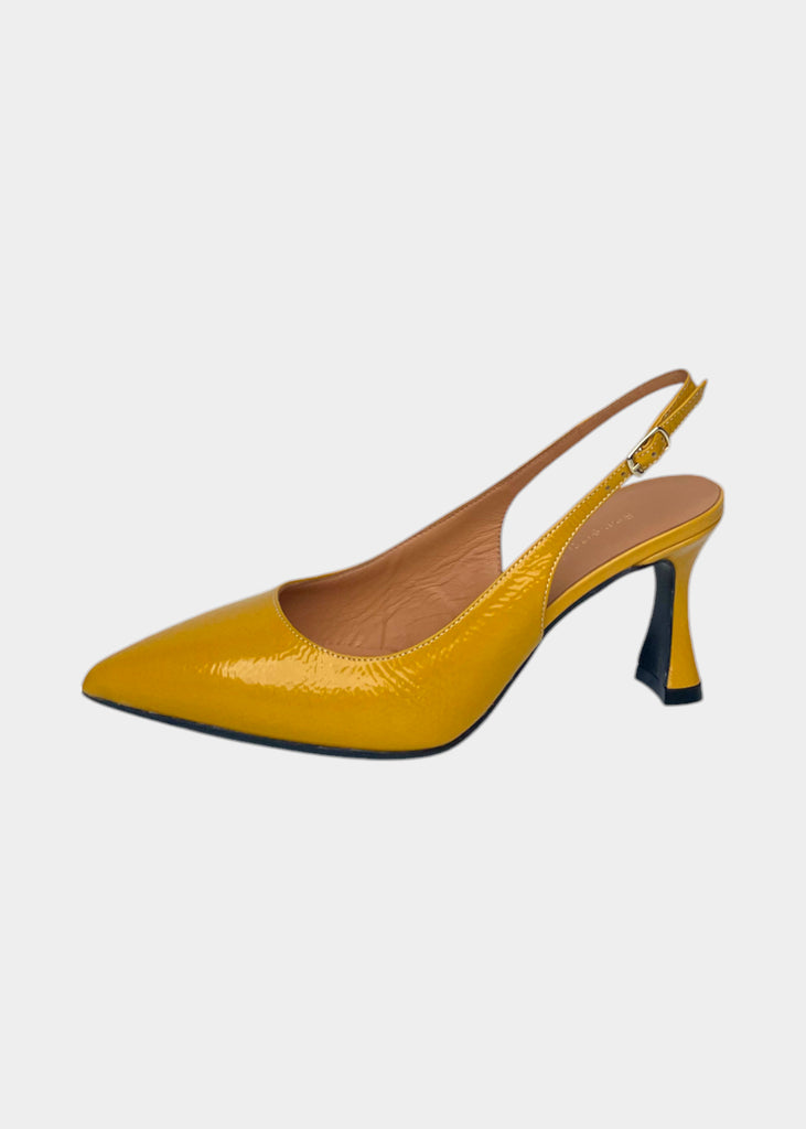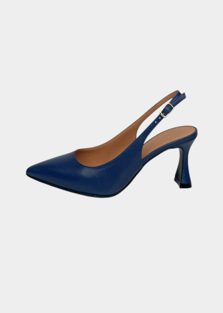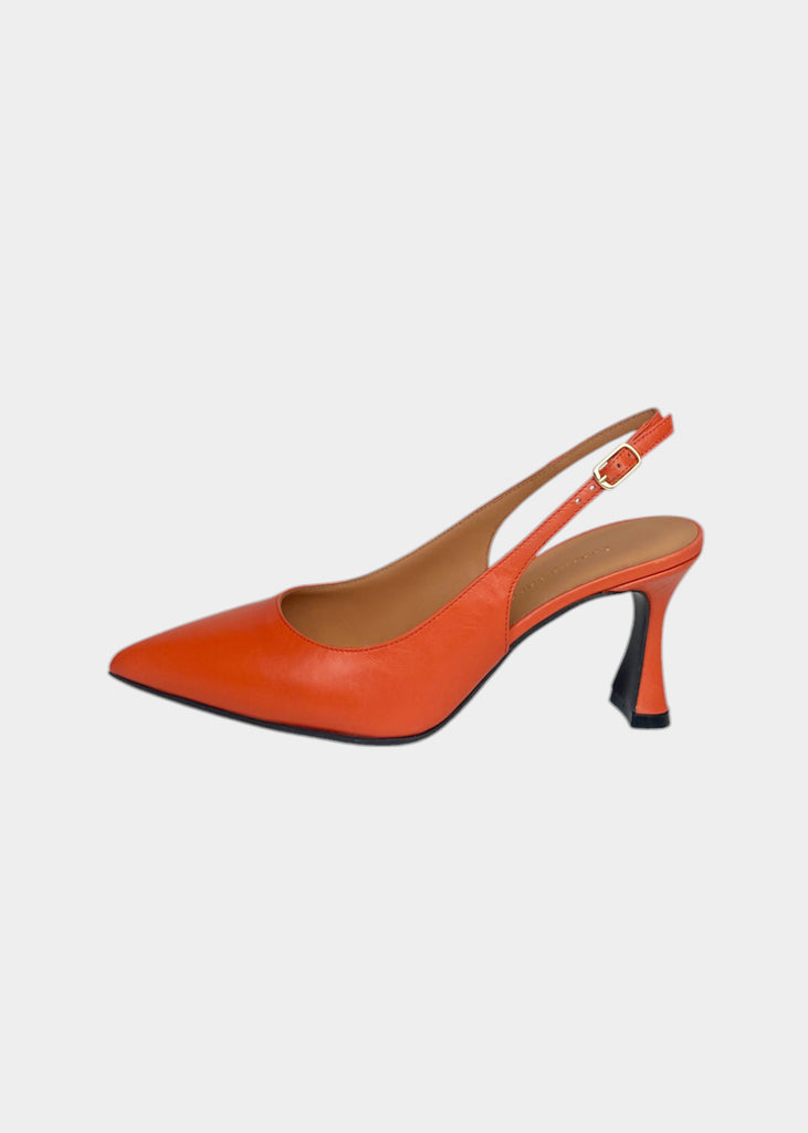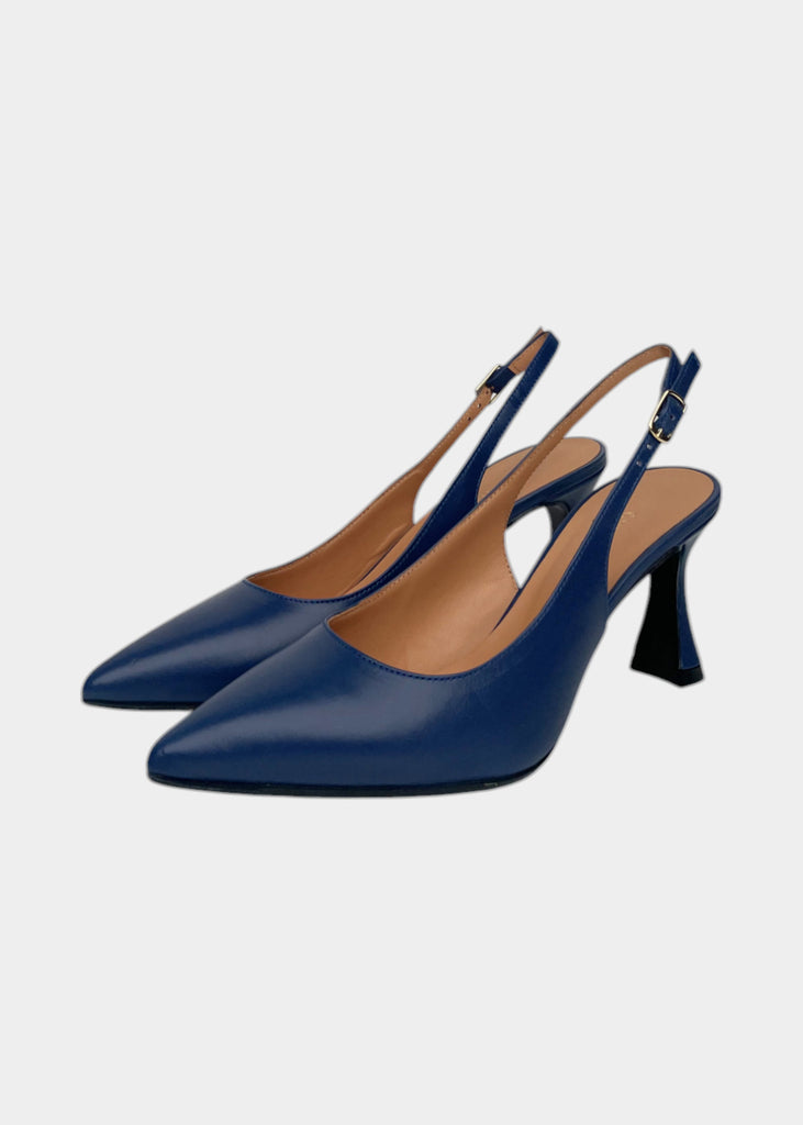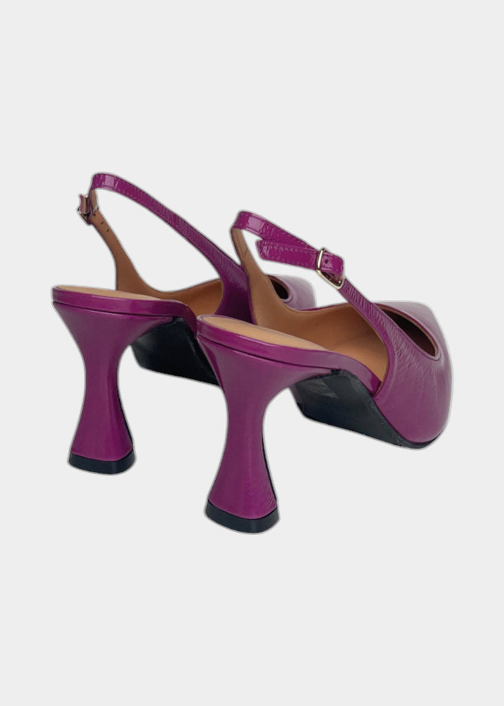 Decolletè con cinturino regolabile e tacco a rocchetto alto 8cm.