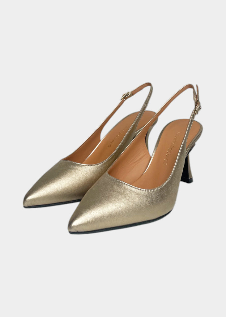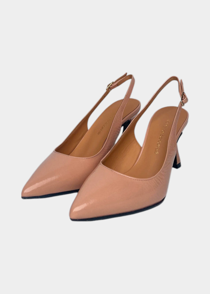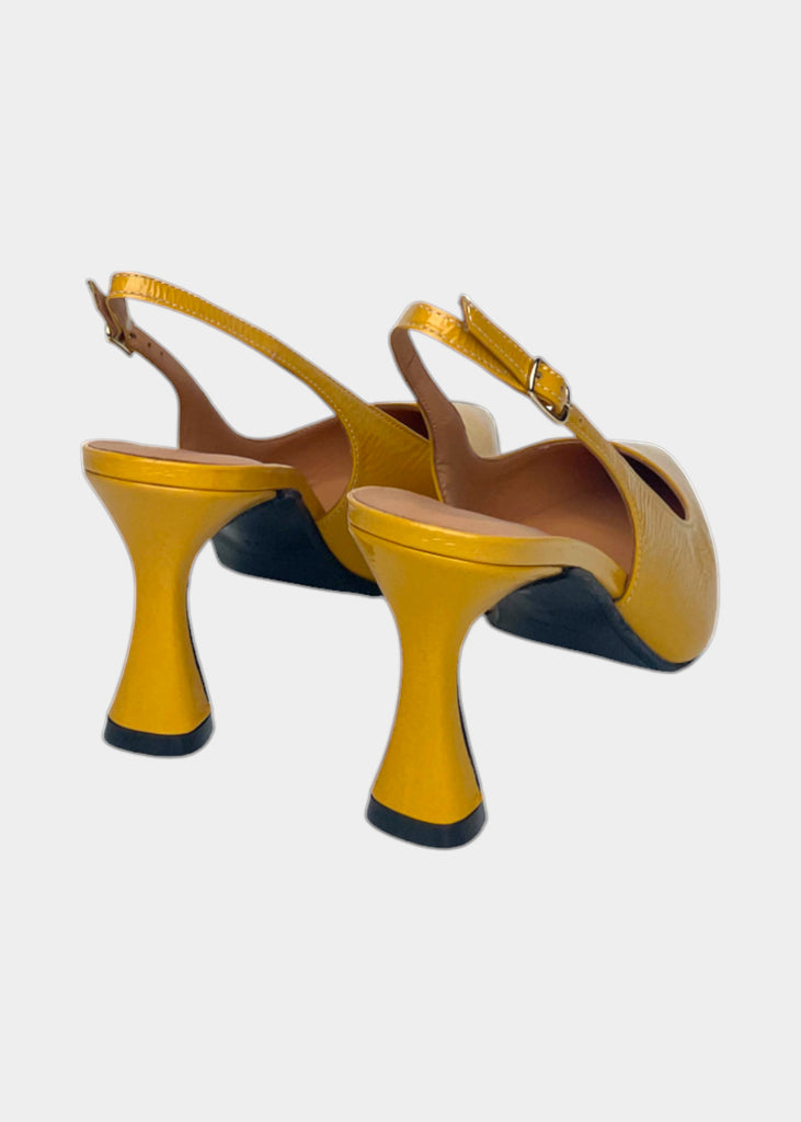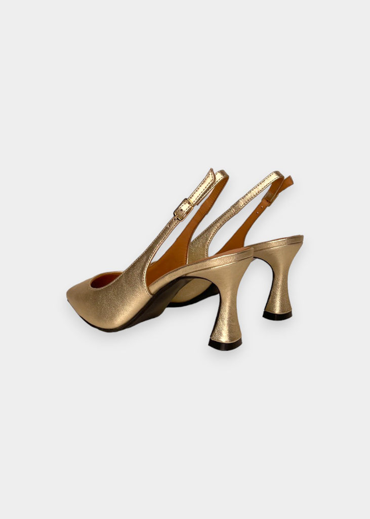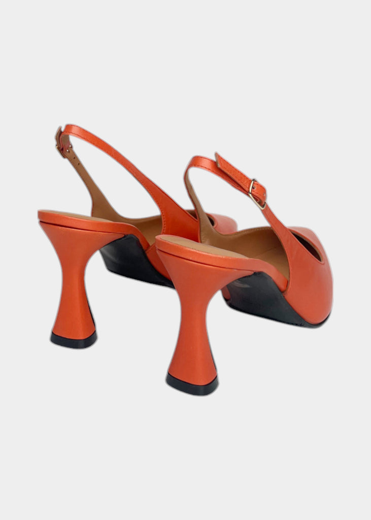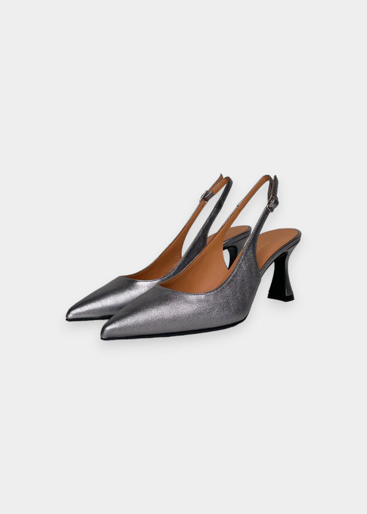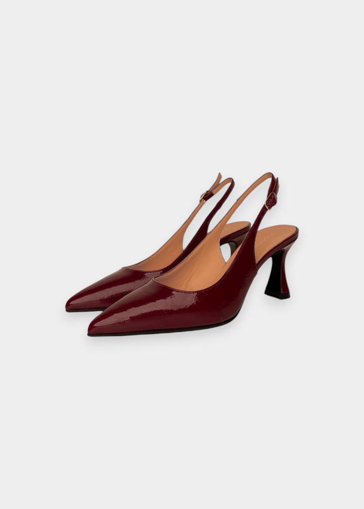 Decolletè con cinturino regolabile e tacco a rocchetto alto 8cm.