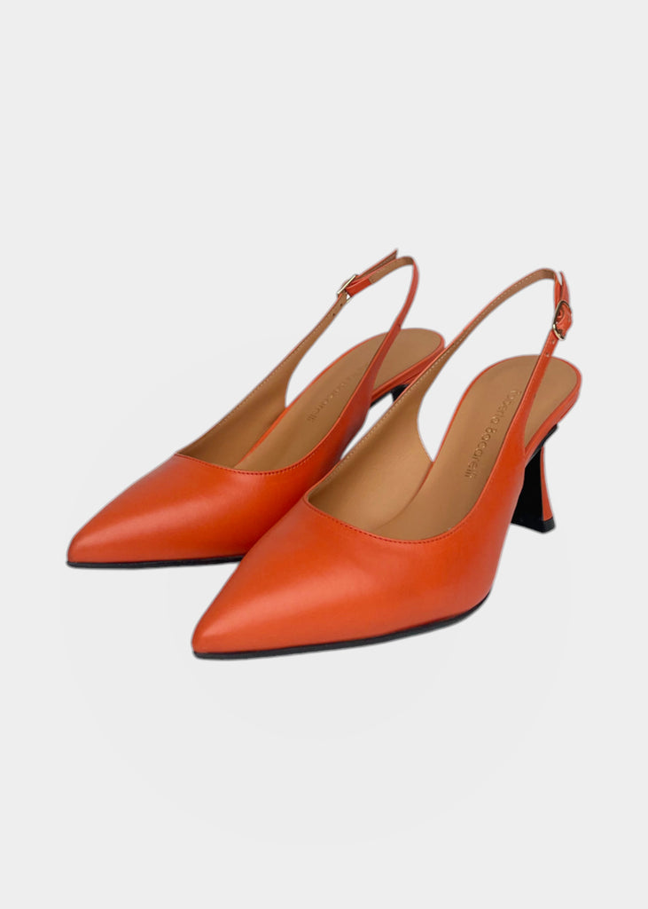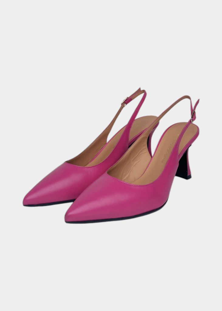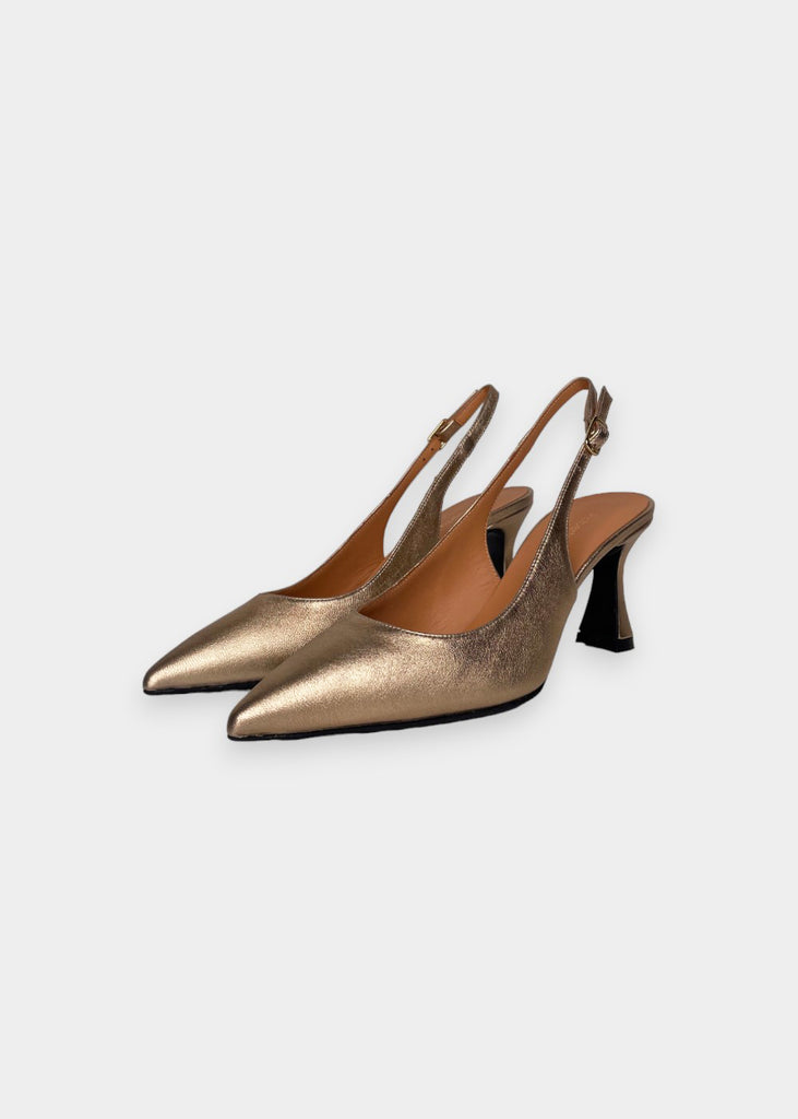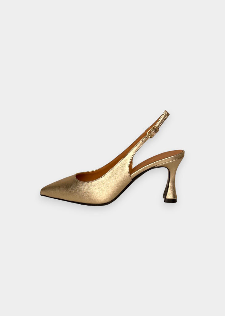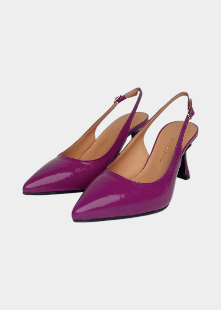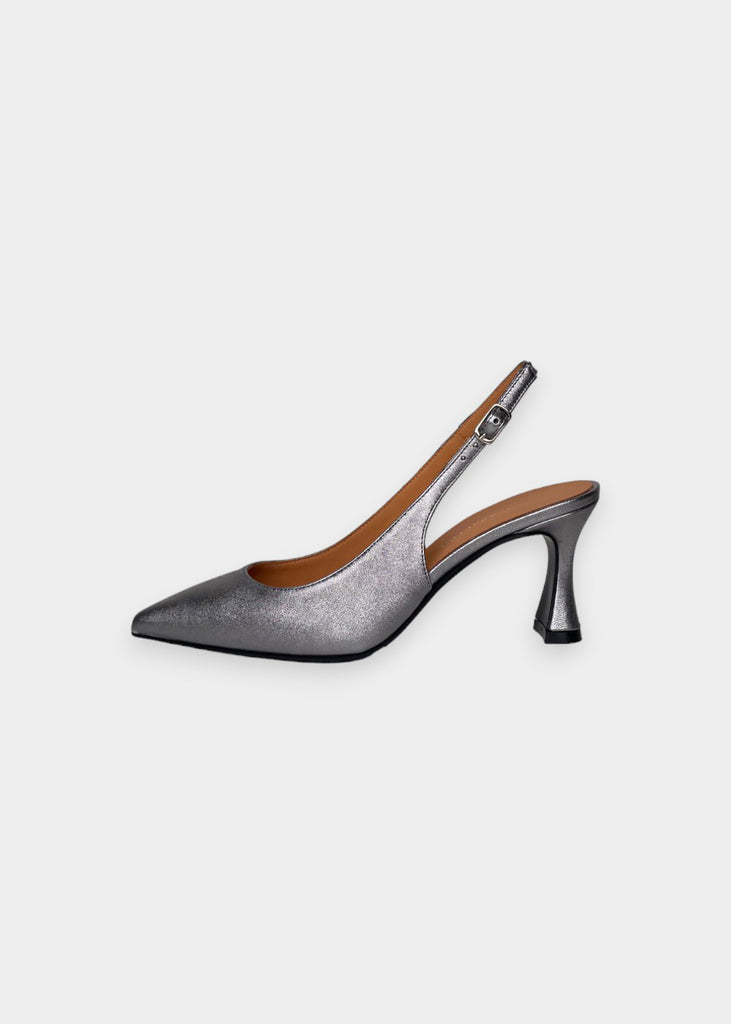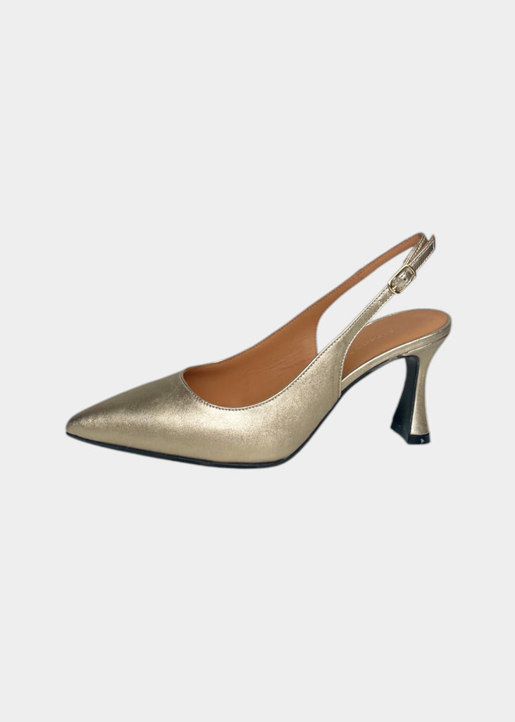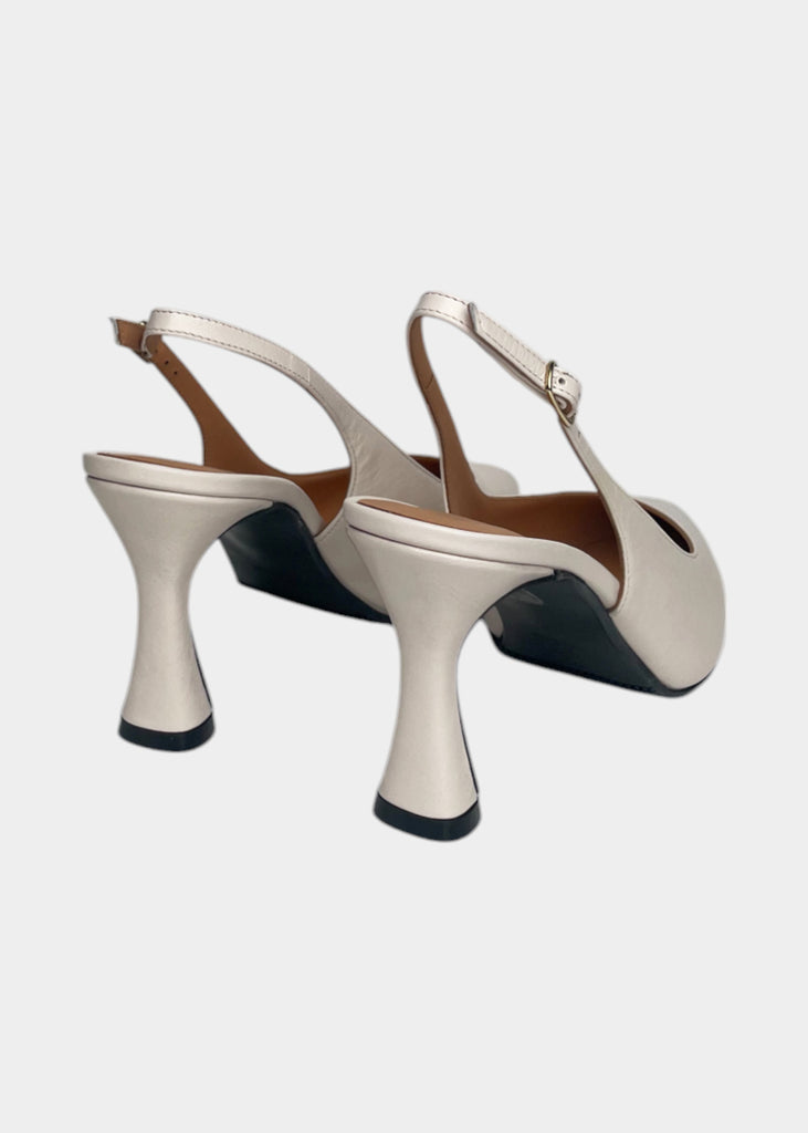 Decolletè con cinturino regolabile e tacco a rocchetto alto 8cm.