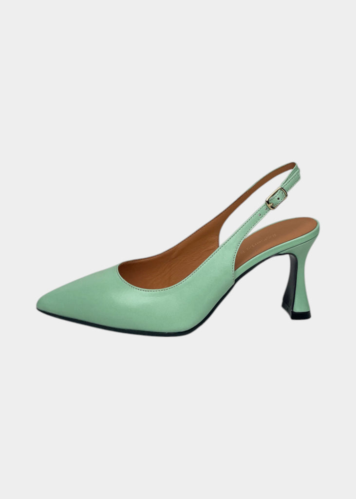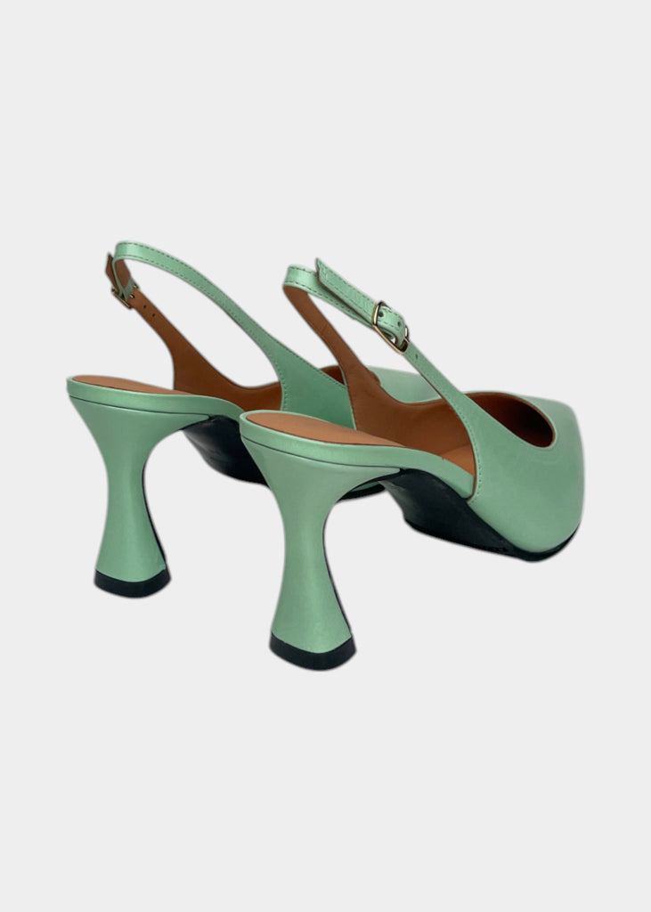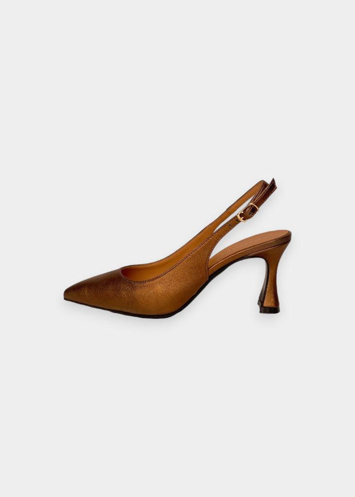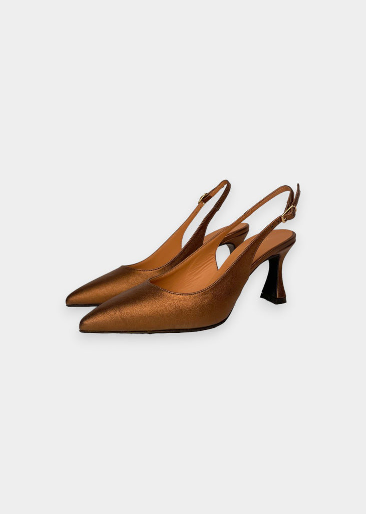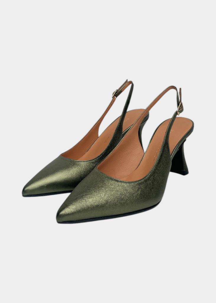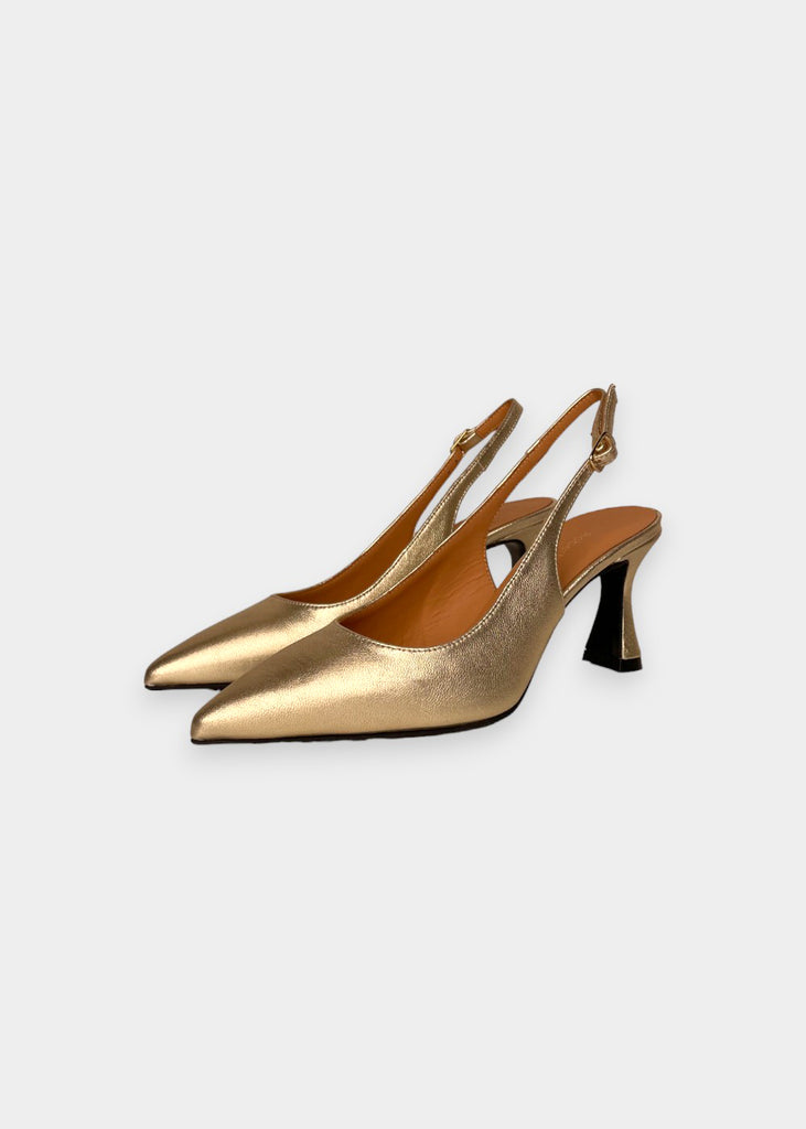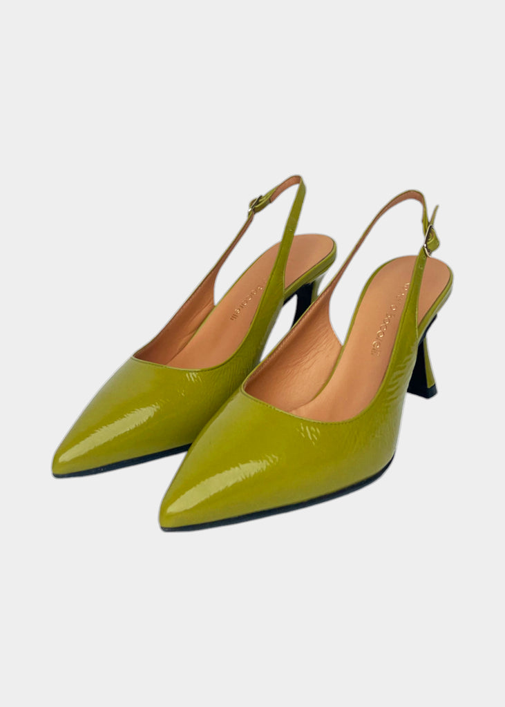 Decolletè con cinturino regolabile e tacco a rocchetto alto 8cm.