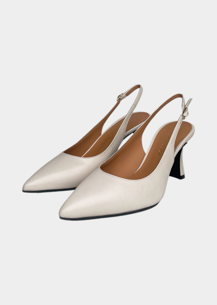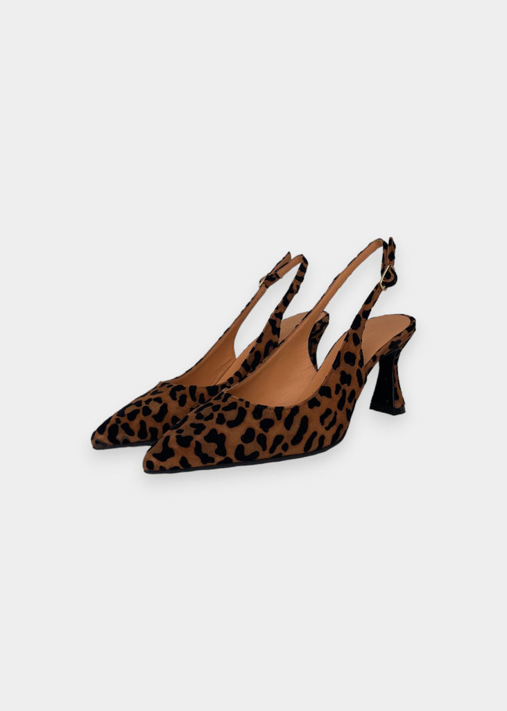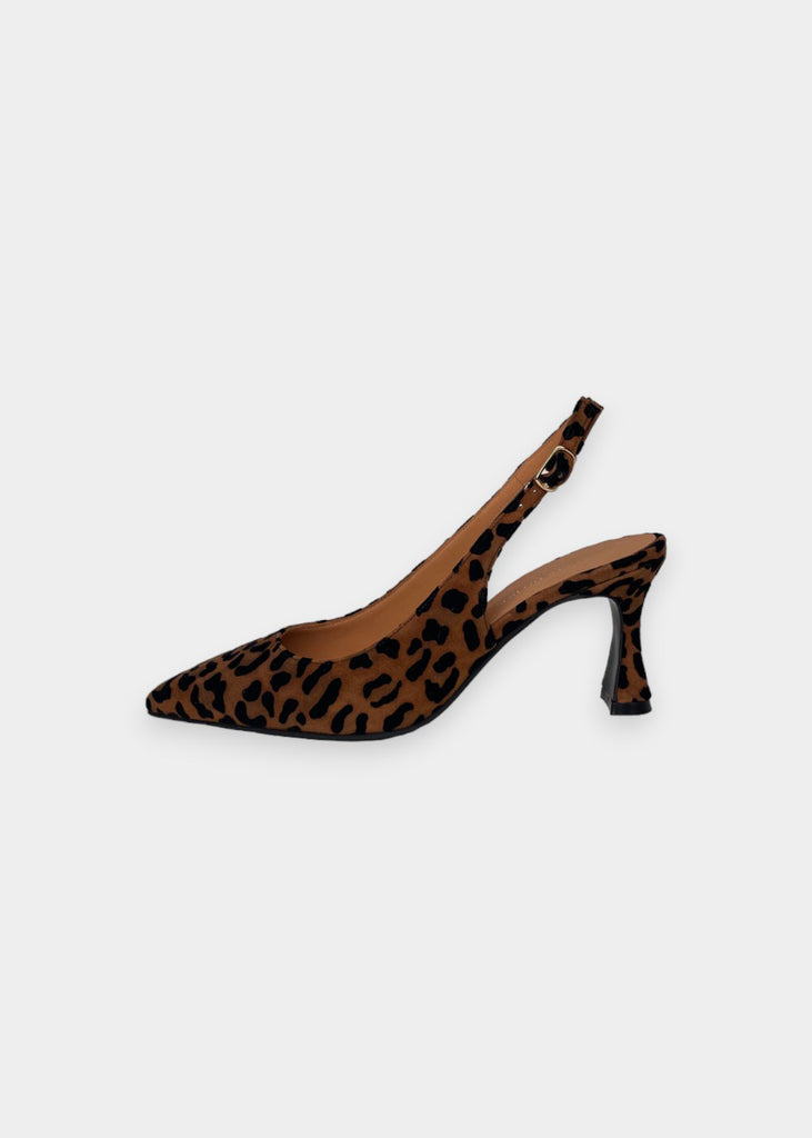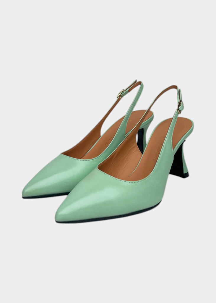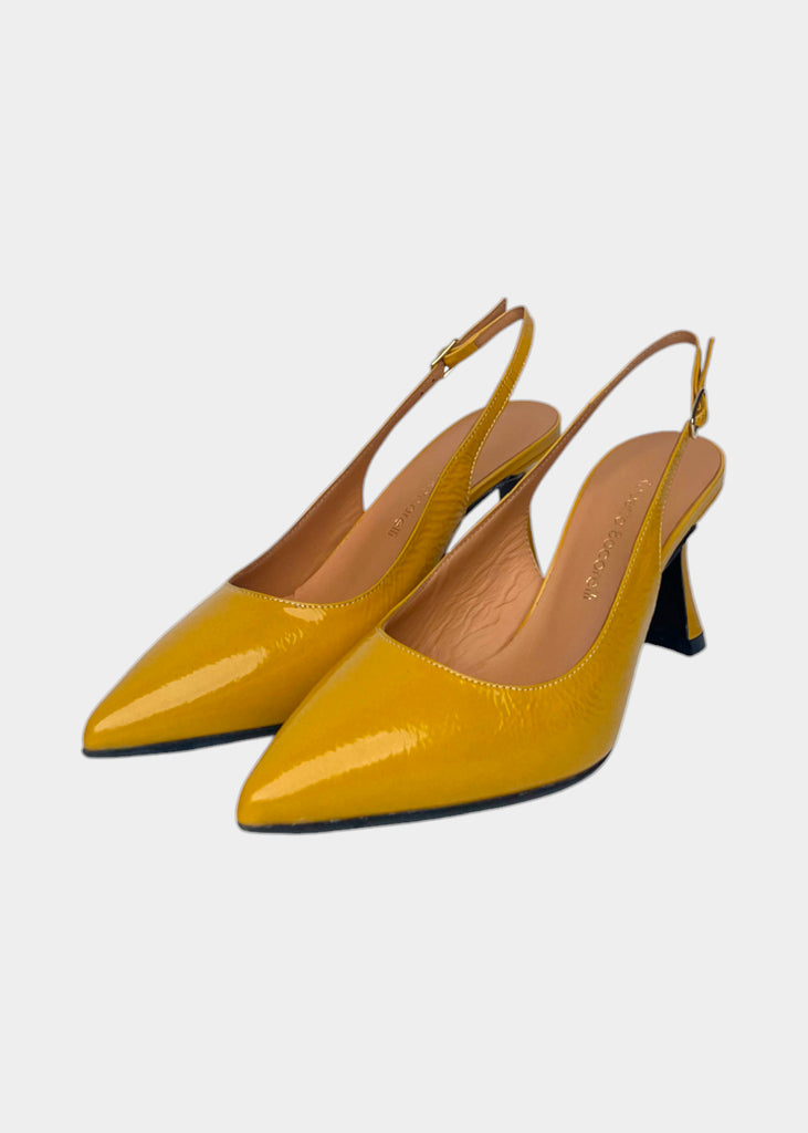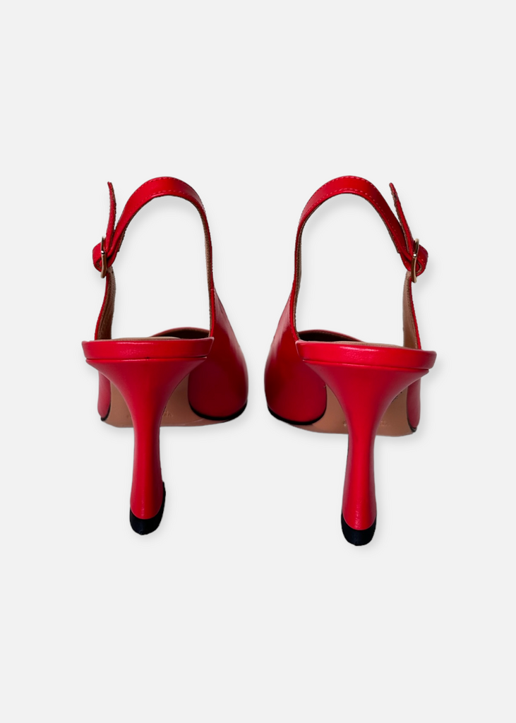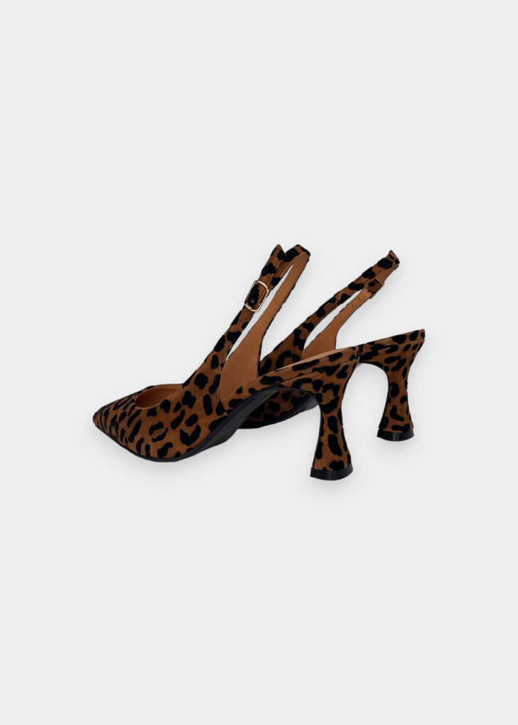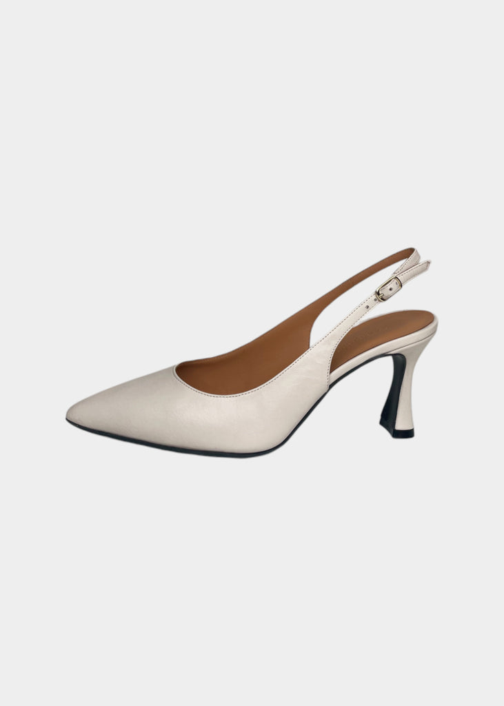 Decolletè con cinturino regolabile e tacco a rocchetto alto 8cm.