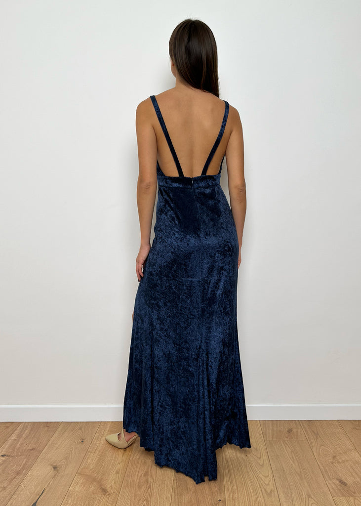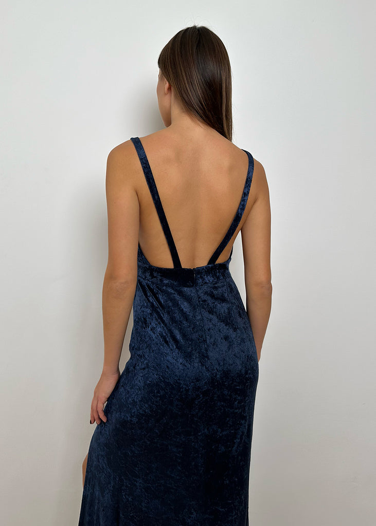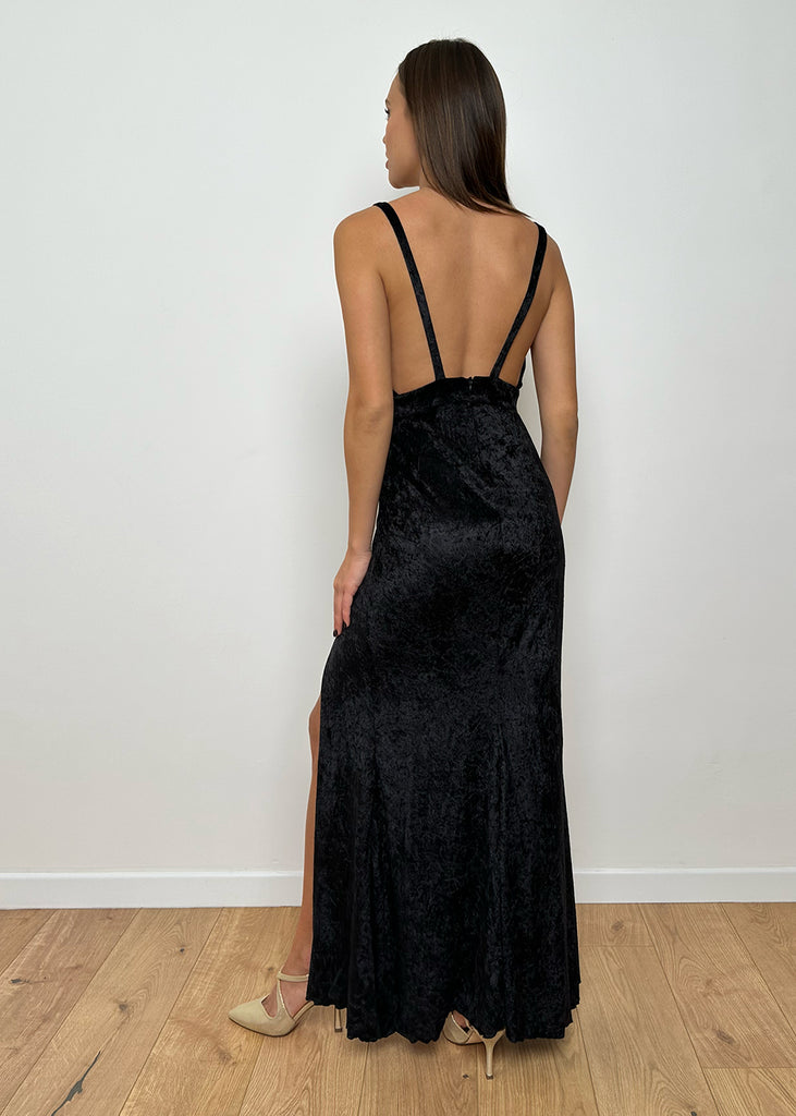 Abito lungo in velluto con spacco frontale. Scollo profondo e cerniera invisibile sul retro.