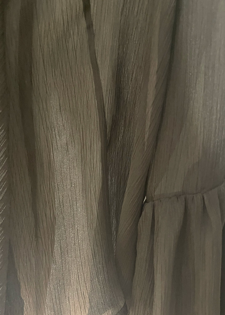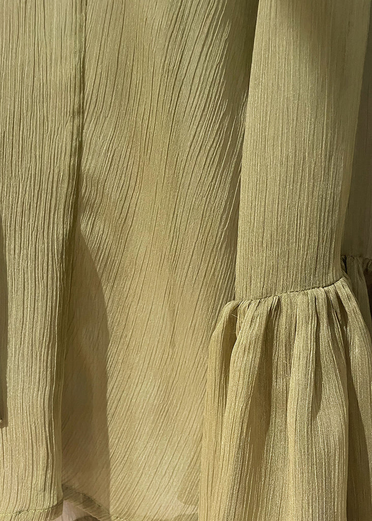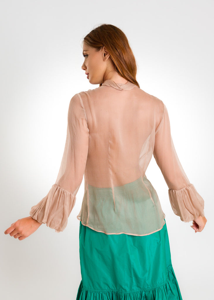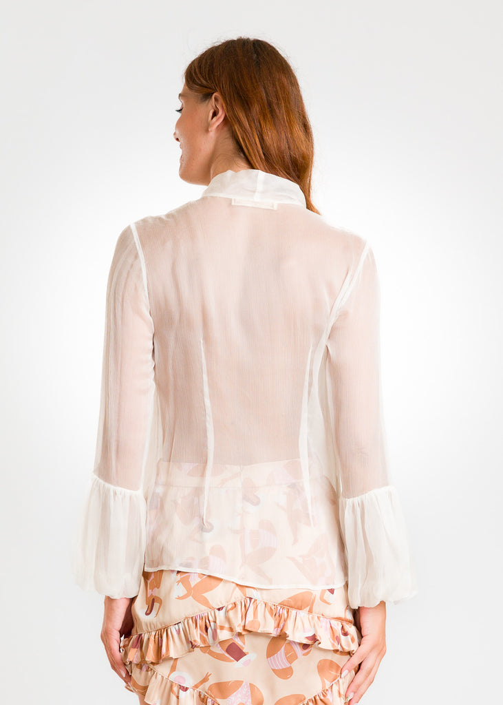 Camicia trasparente con fiocco al collo e maniche con polsino volant.