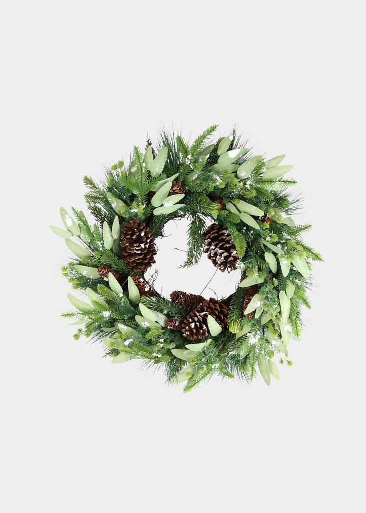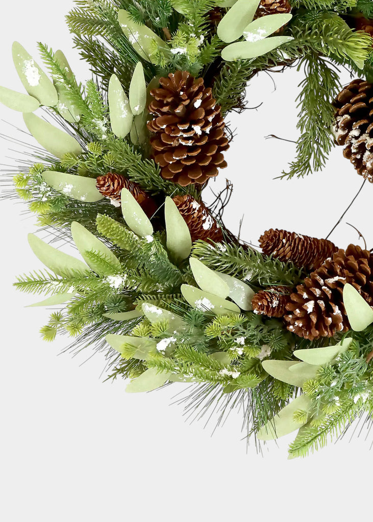 Ghirlanda decorativa natalizia con foglie e pigne.