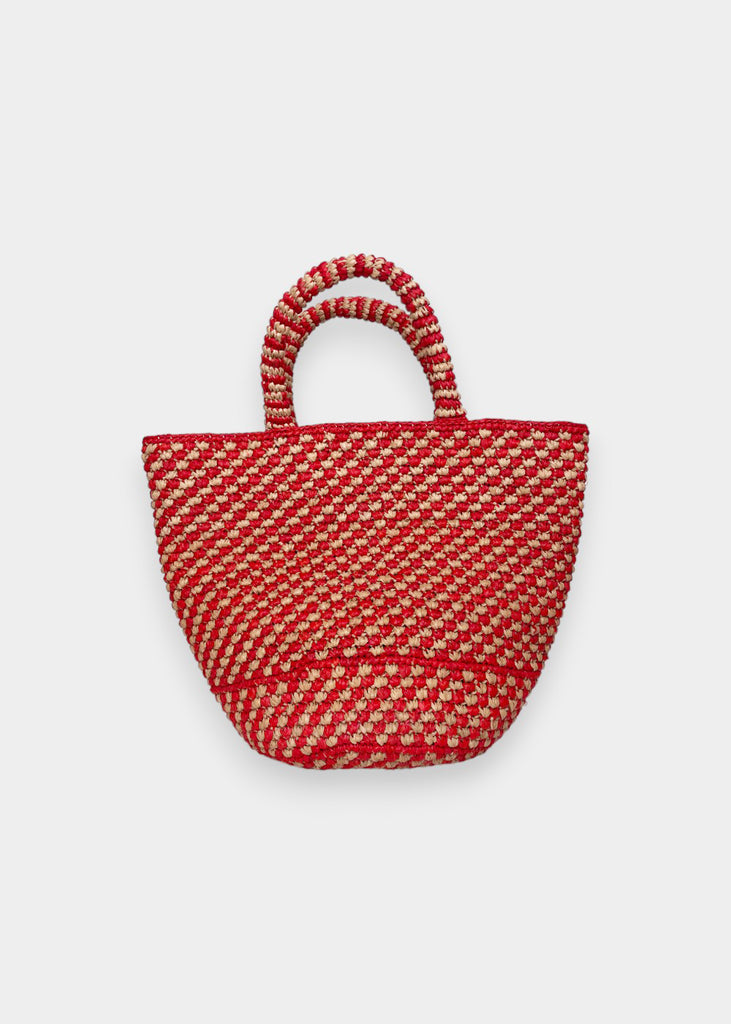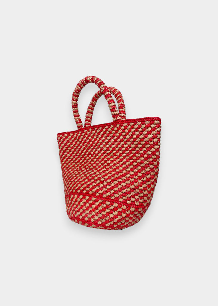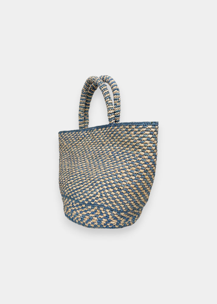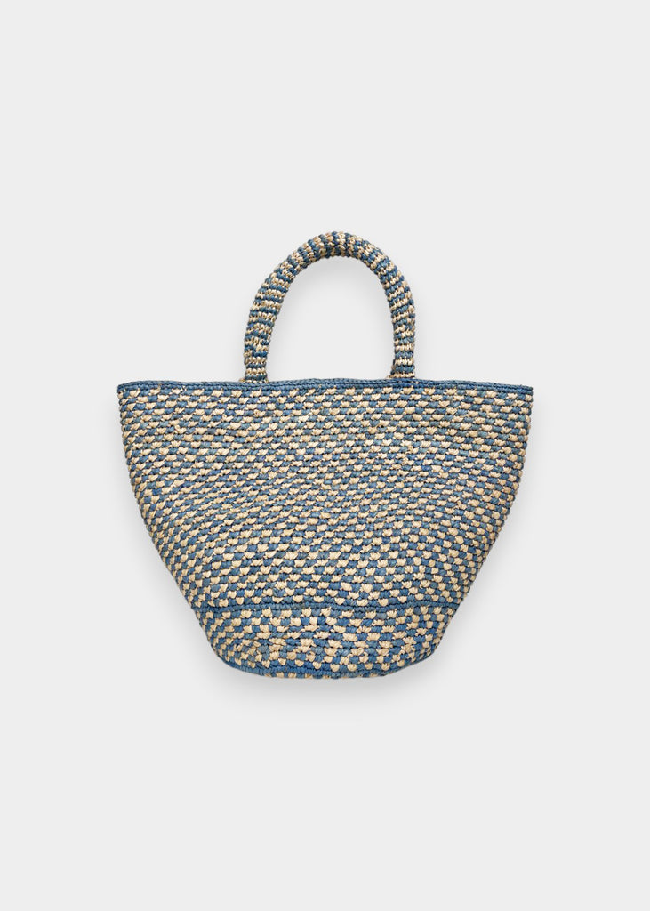 Borsa in raffia bicolore e chiusura con bottone automatico.