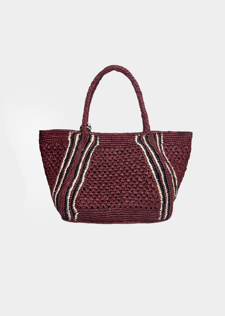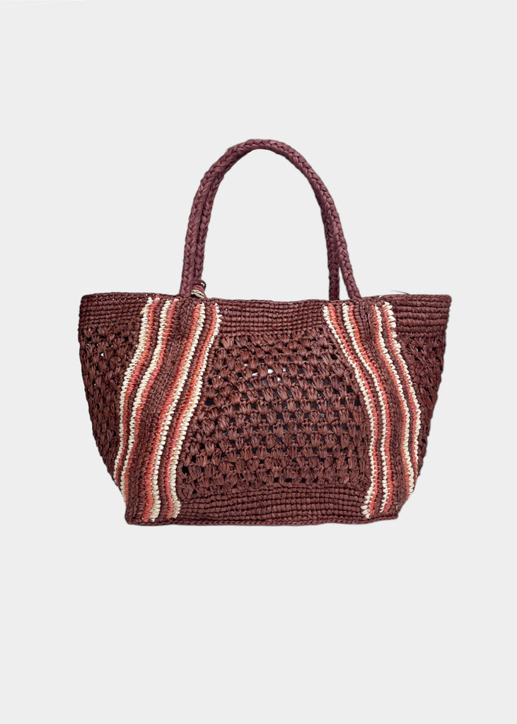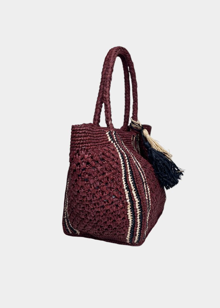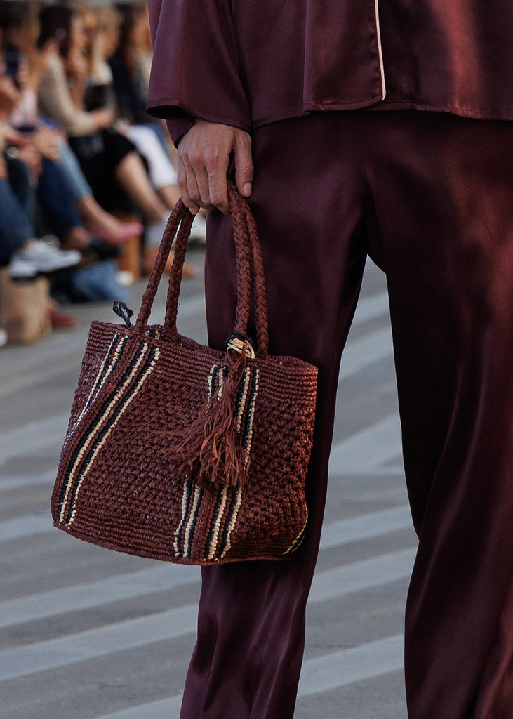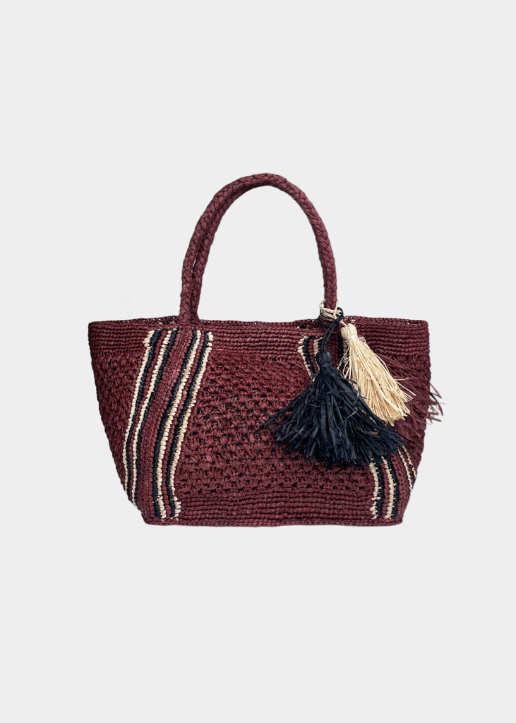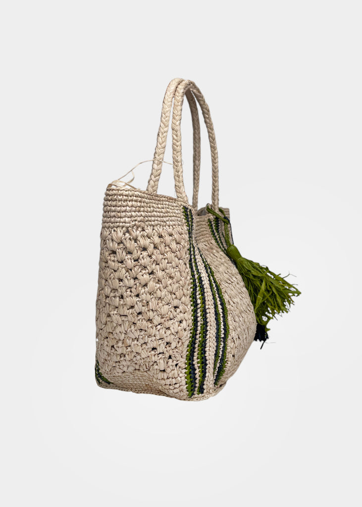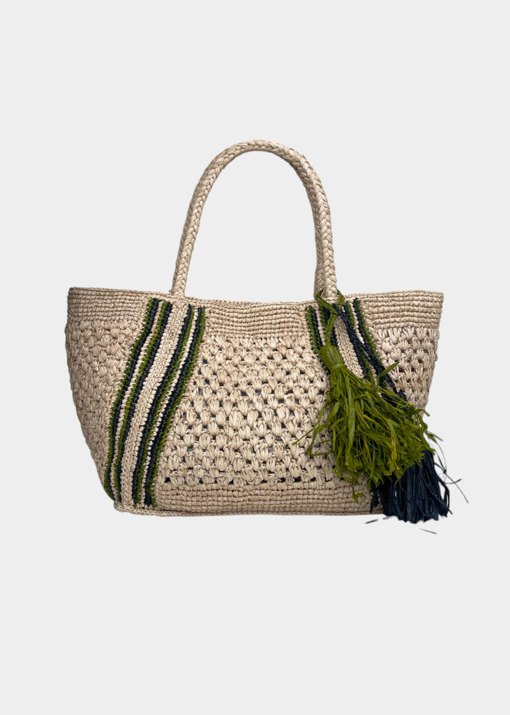 Borsa con contrasti colorati e nappine in raffia. Chiusura con bottone automatico.