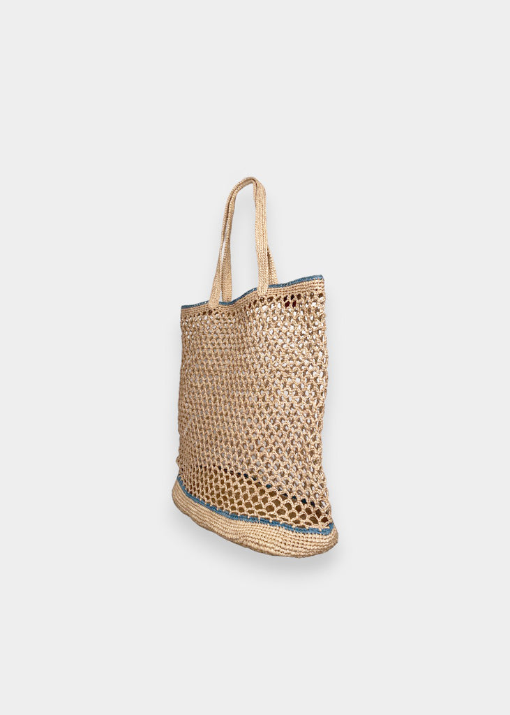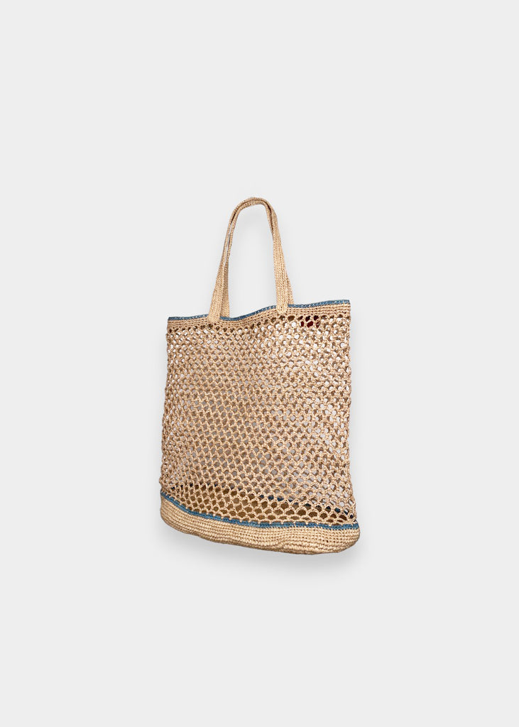 Borsa shopper morbida, in raffia bucherellata con manici lunghi e chiusura con bottone automatico.
