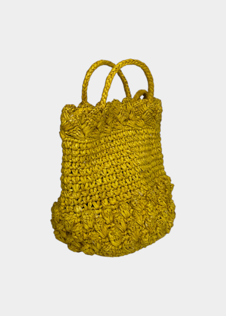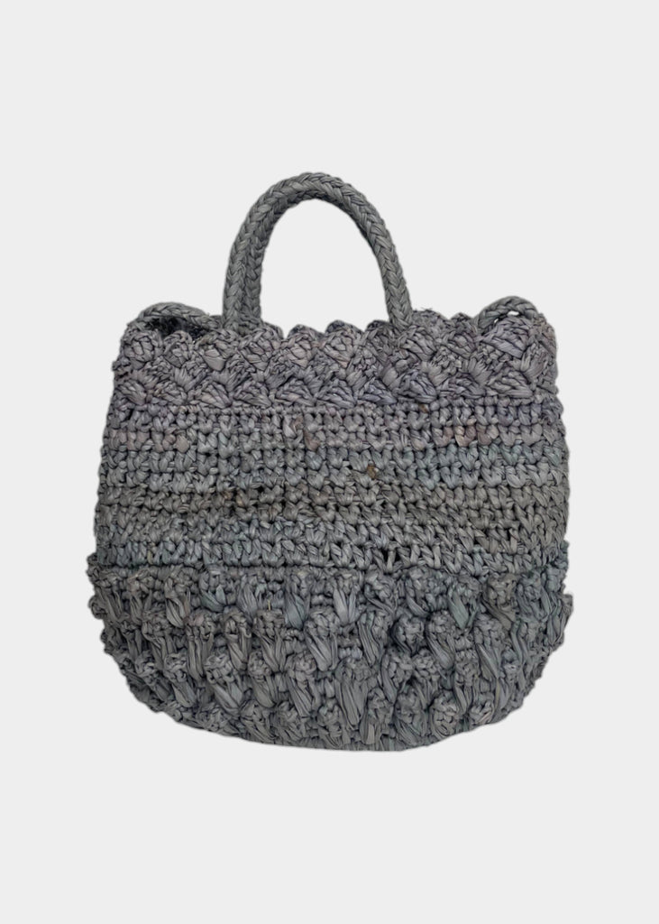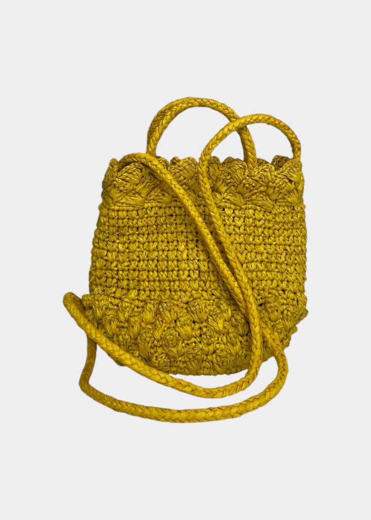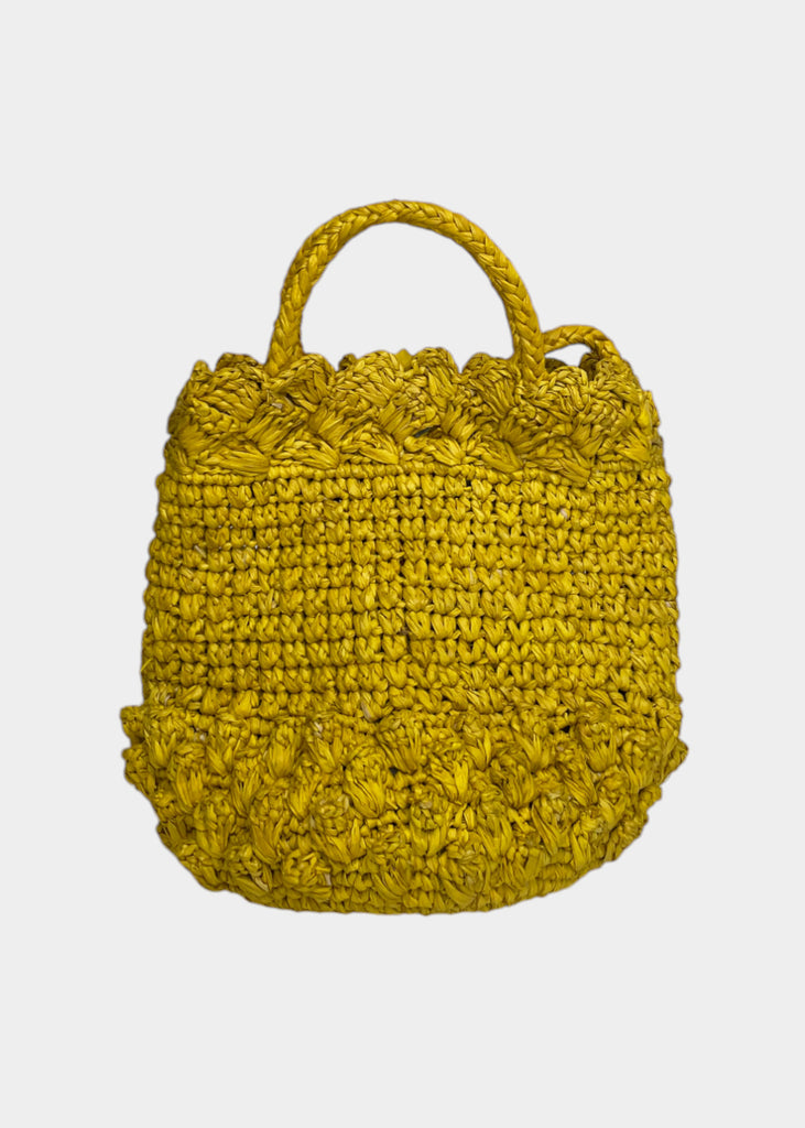 Borsetta in raffia con manici corti e tracolla. Chiusura con bottone automatico.