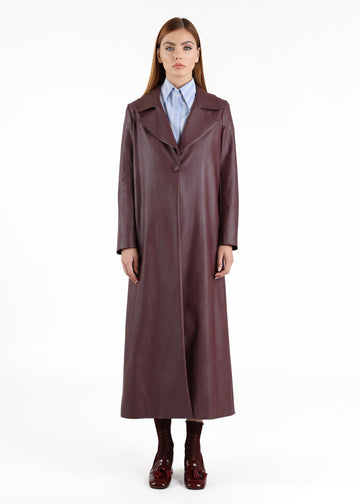 Cappotto lungo in pelle vegana realizzato in materiali completamente di origine vegetale.