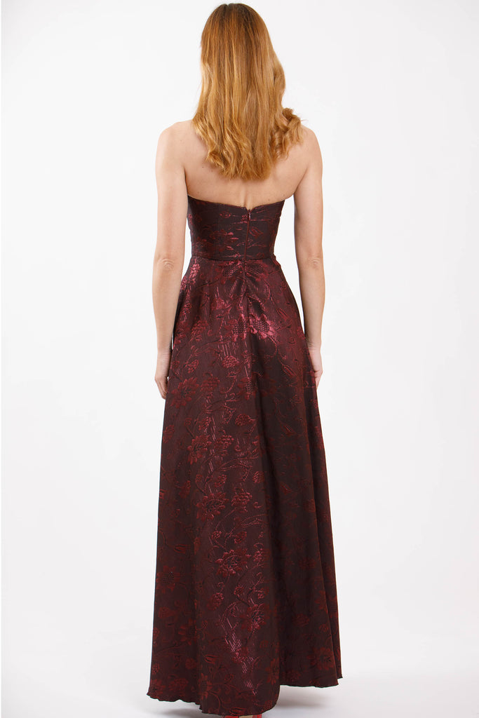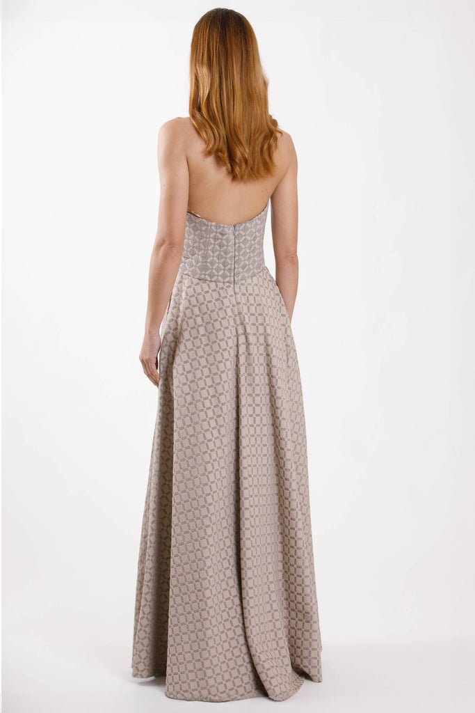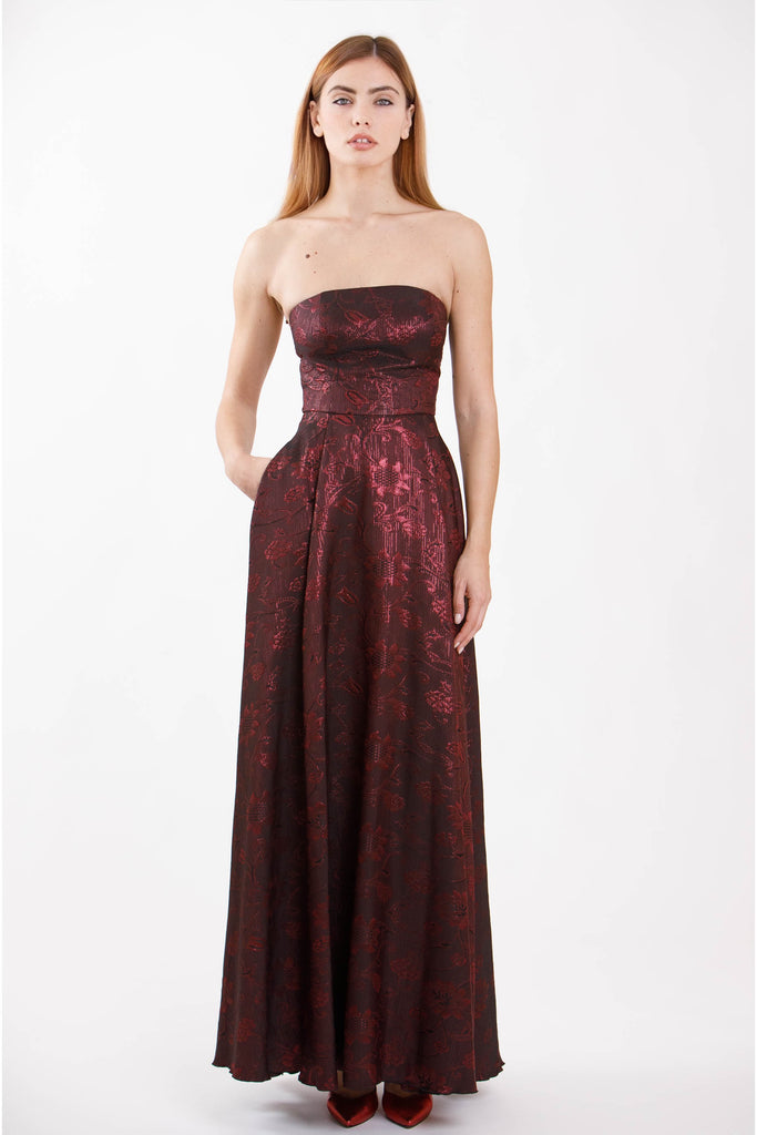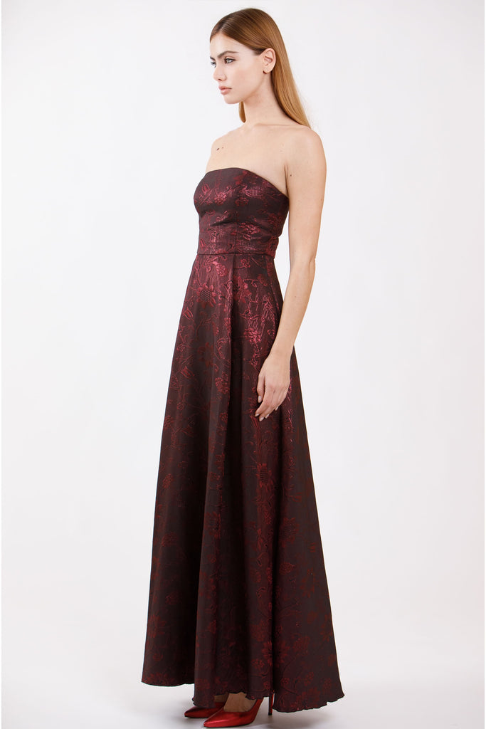 Abito lungo con spalle scoperte e cerniera sul retro.