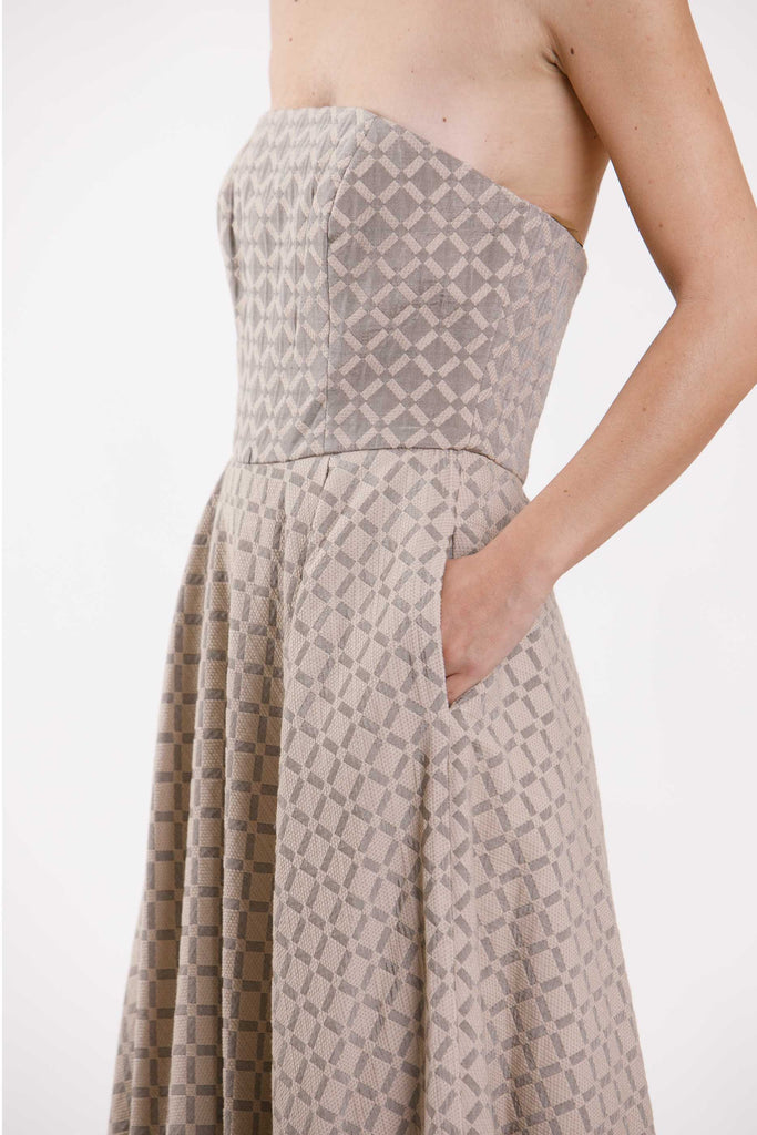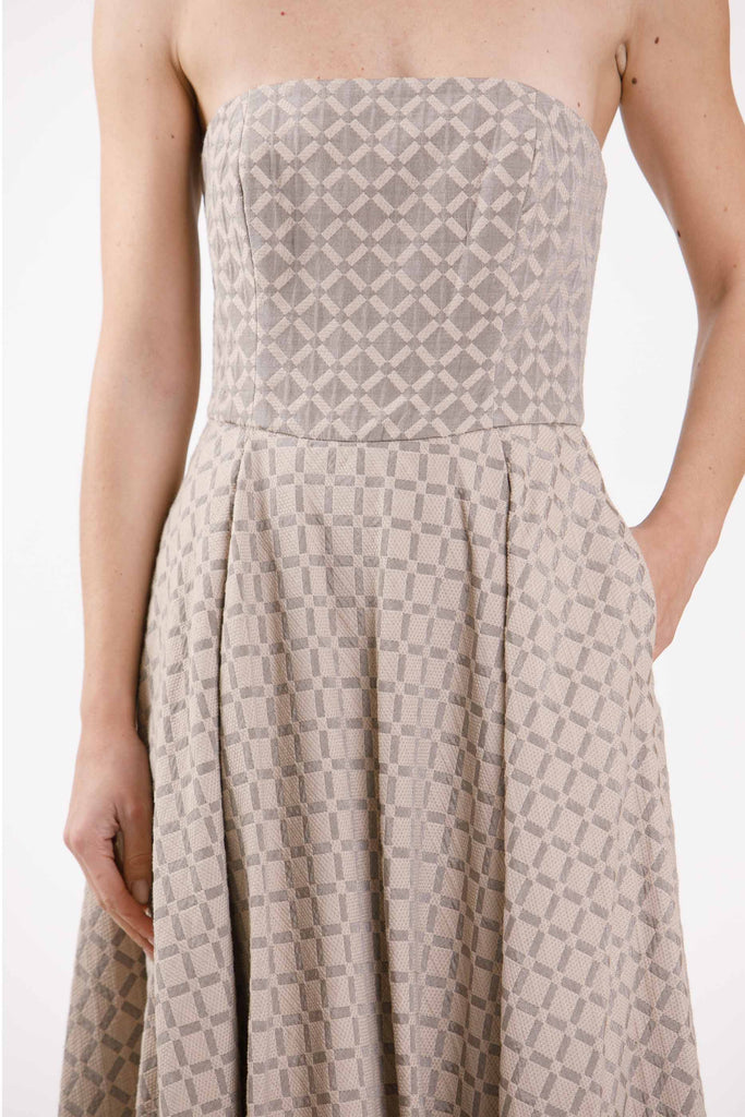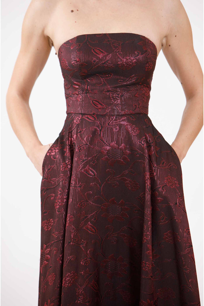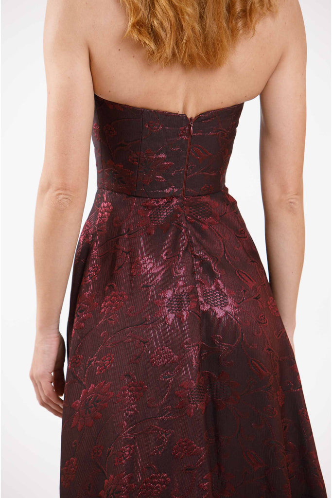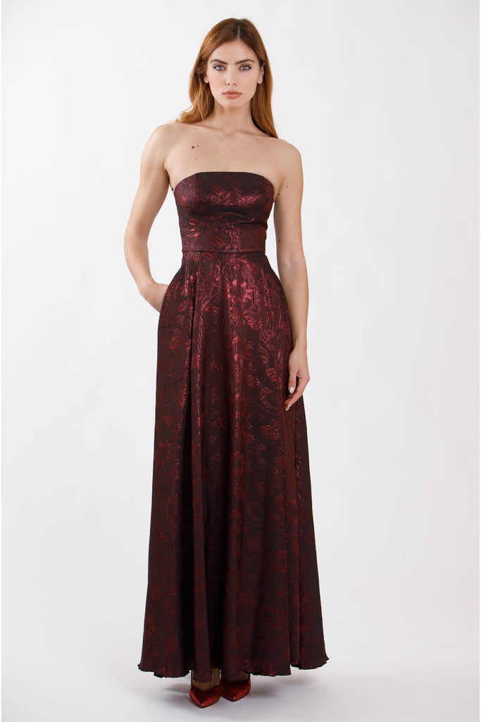 Abito lungo con spalle scoperte e cerniera sul retro.
