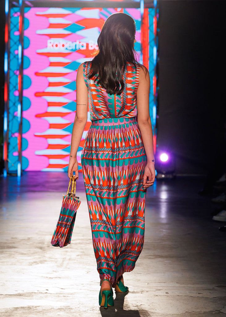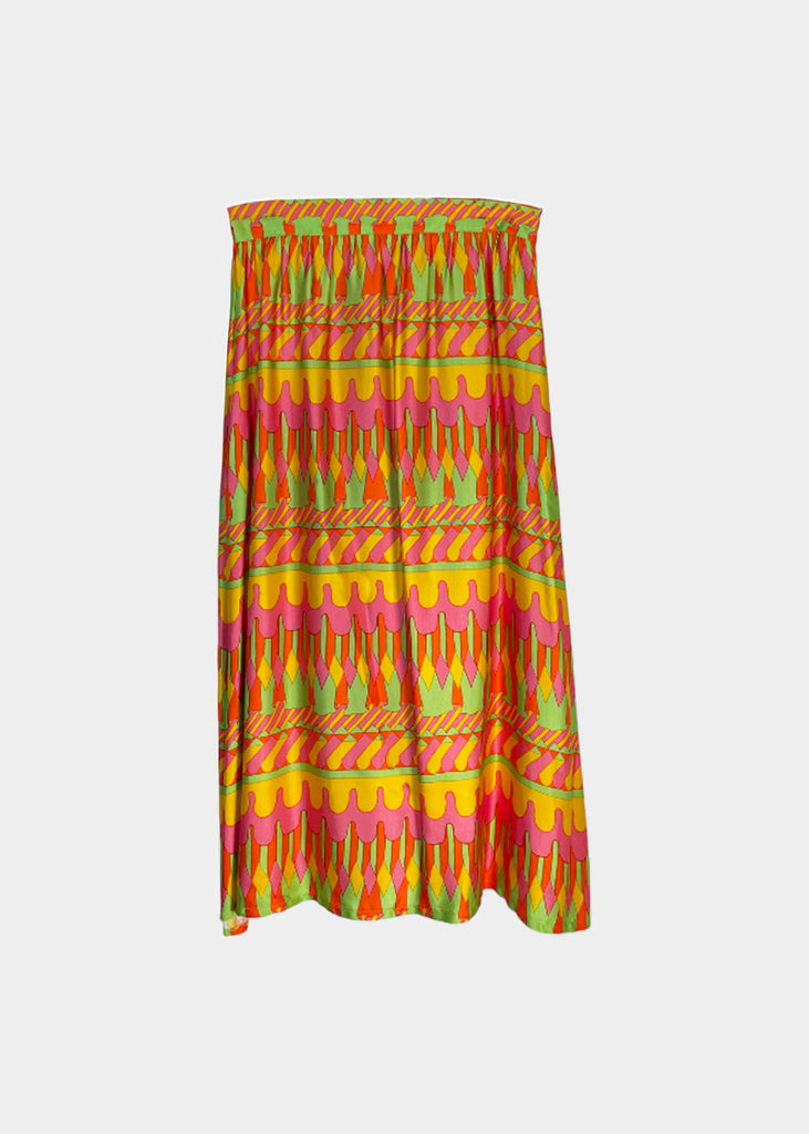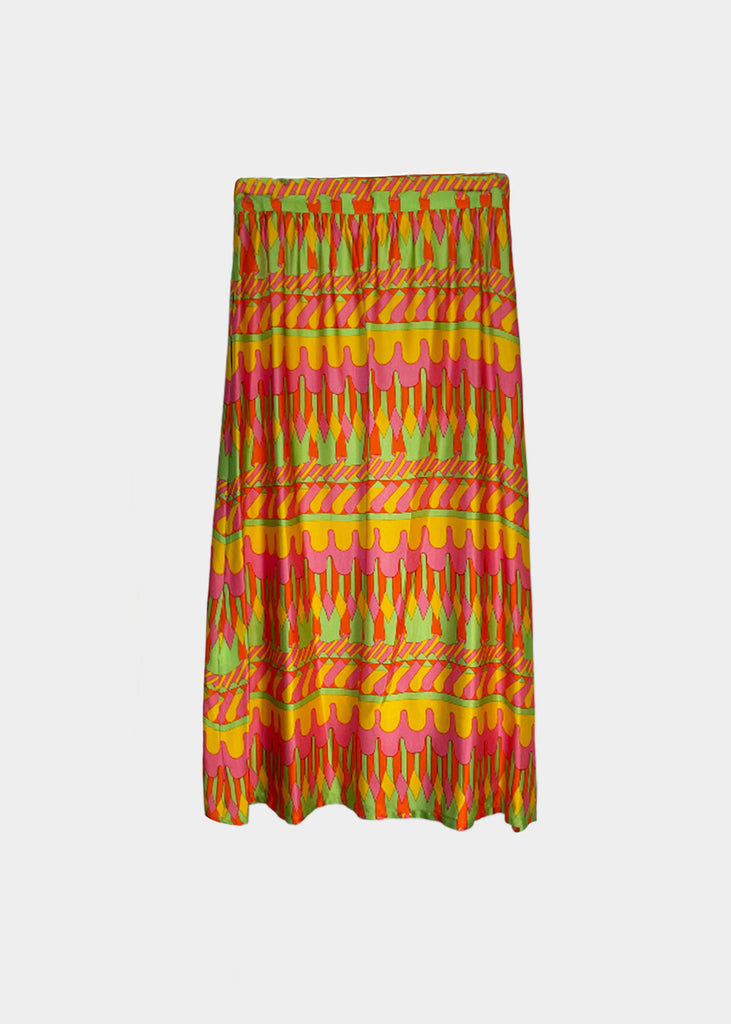 Completo in seta fantasia geometrica. Casacca e gonna lunga con elastico in vita.