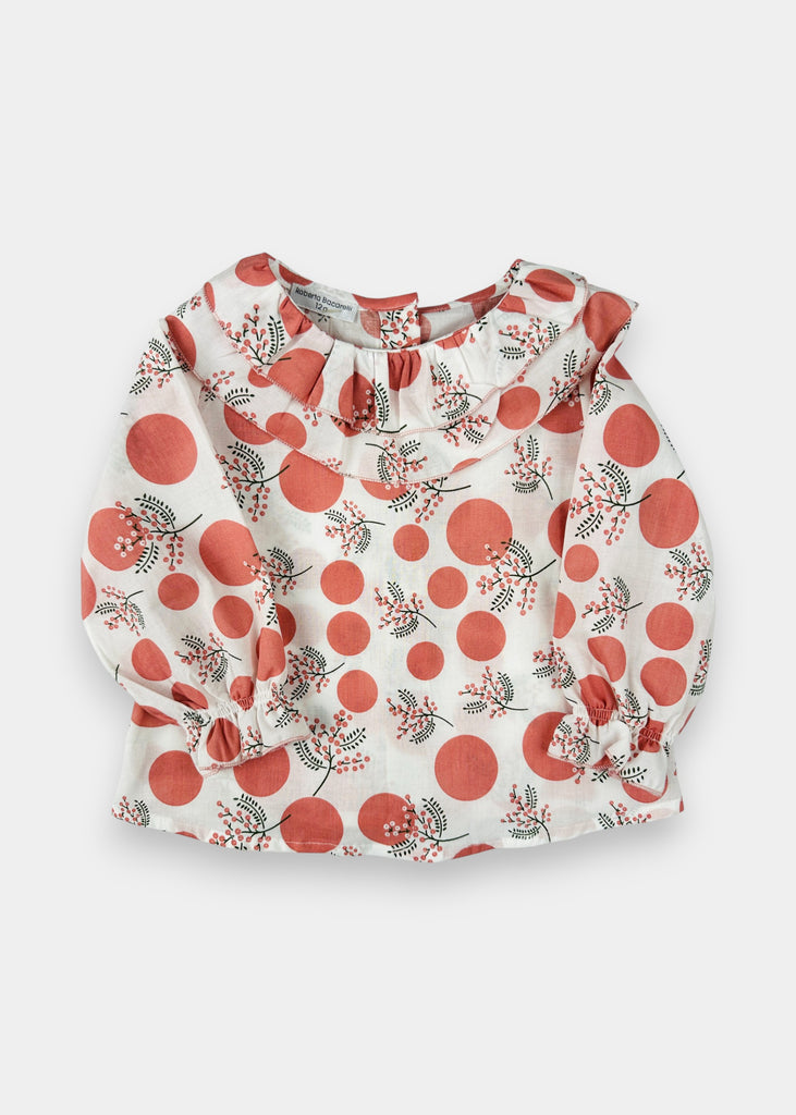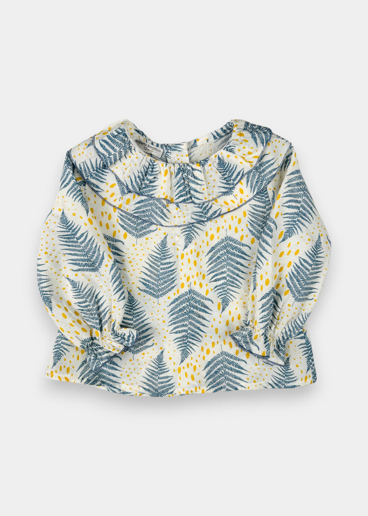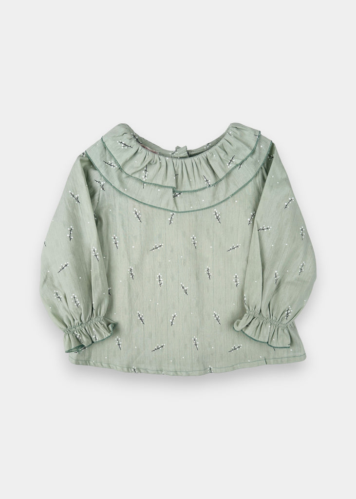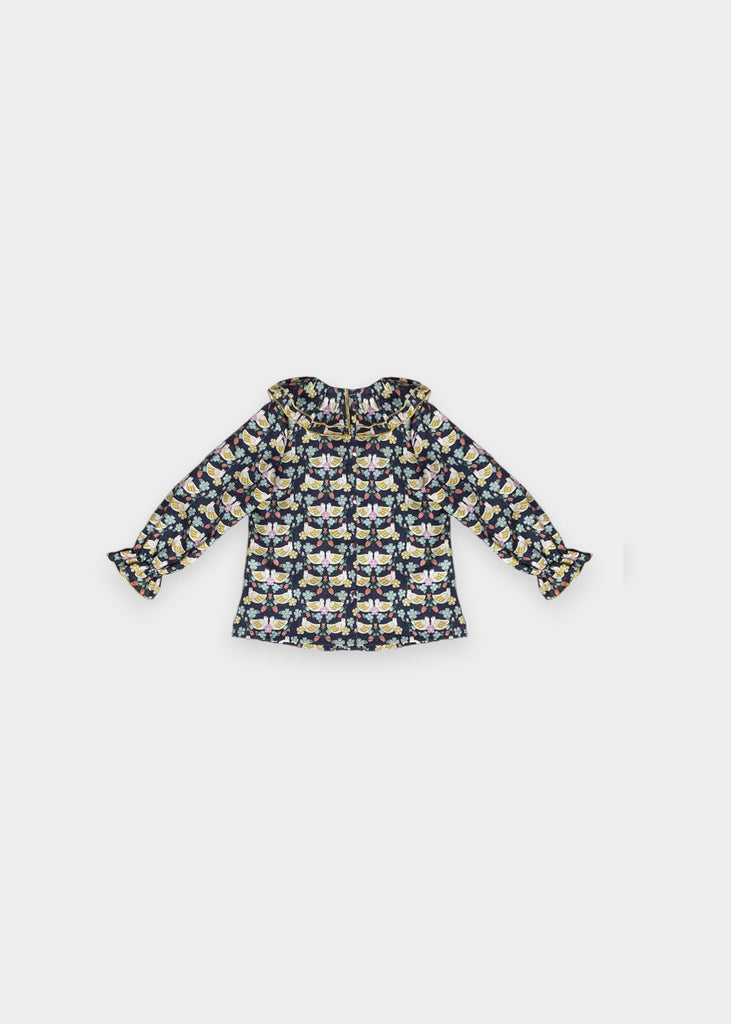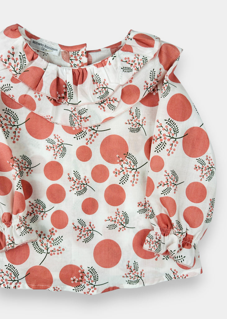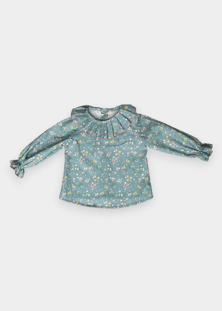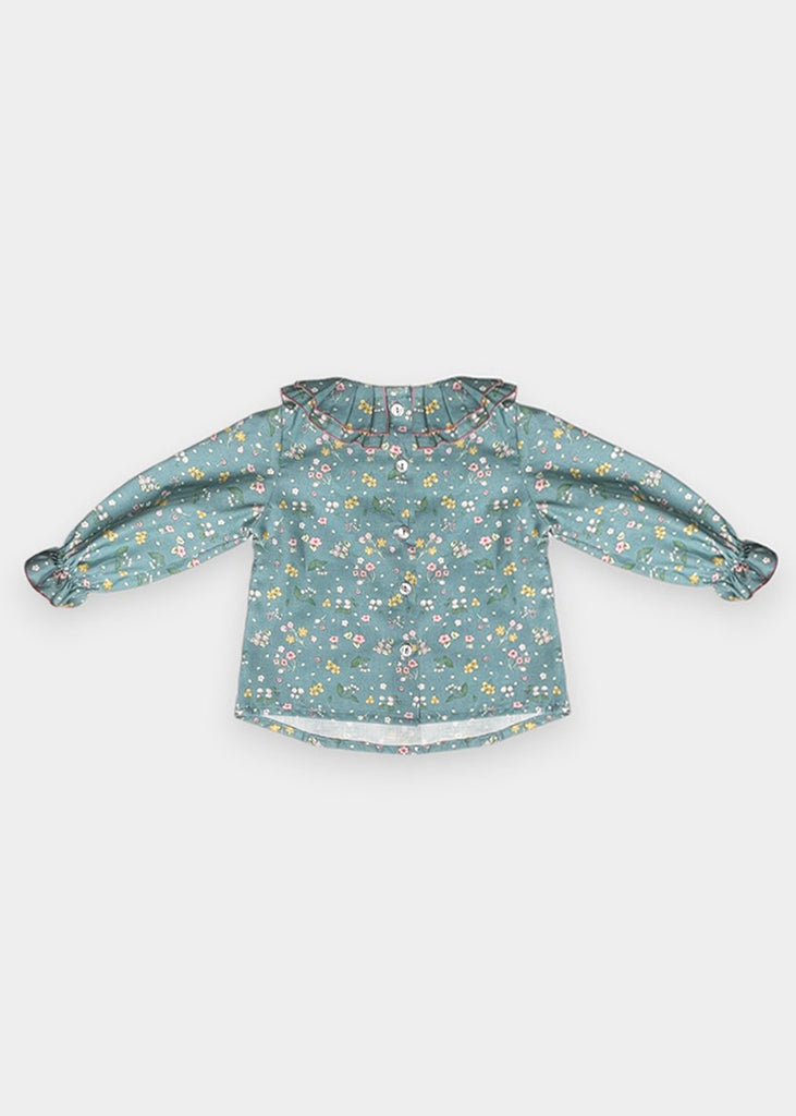 Camicia in 100% cotone con colletto doppia rouches e bottoni sul retro.