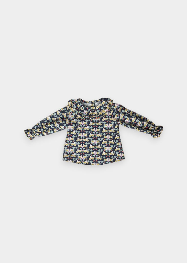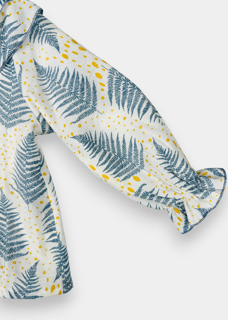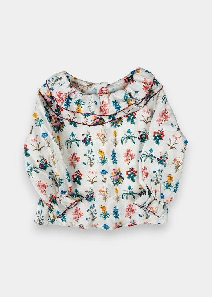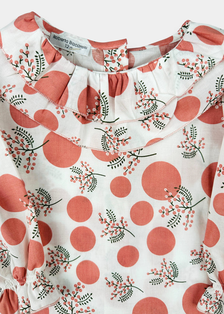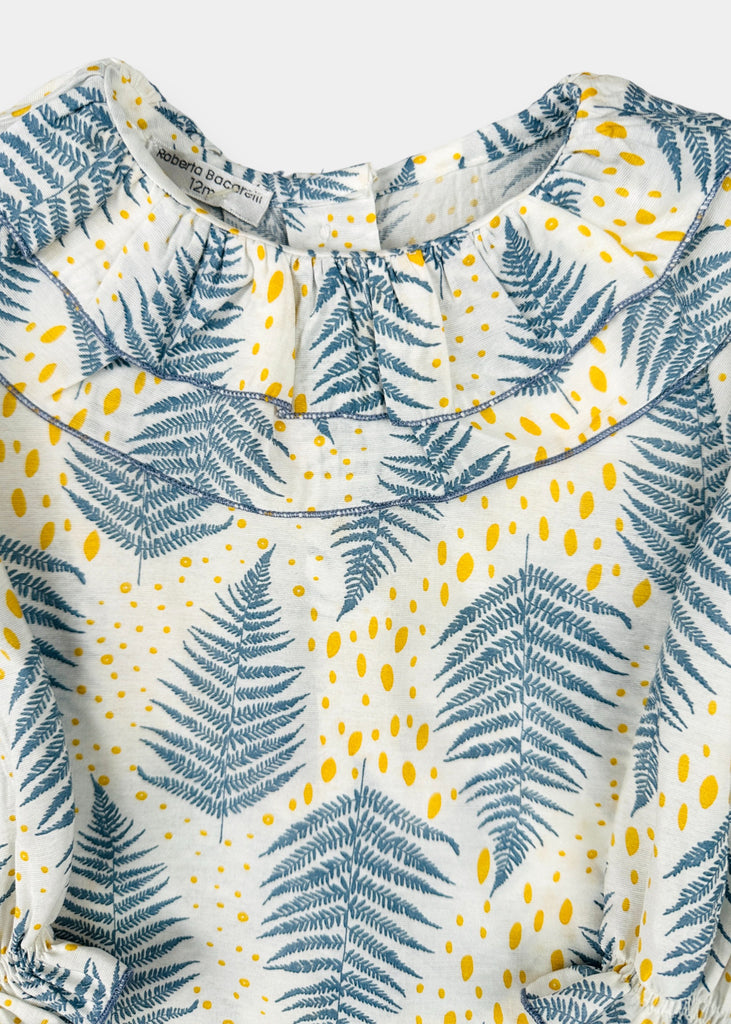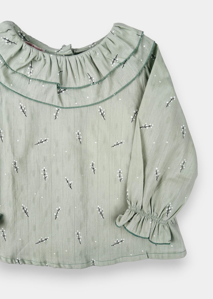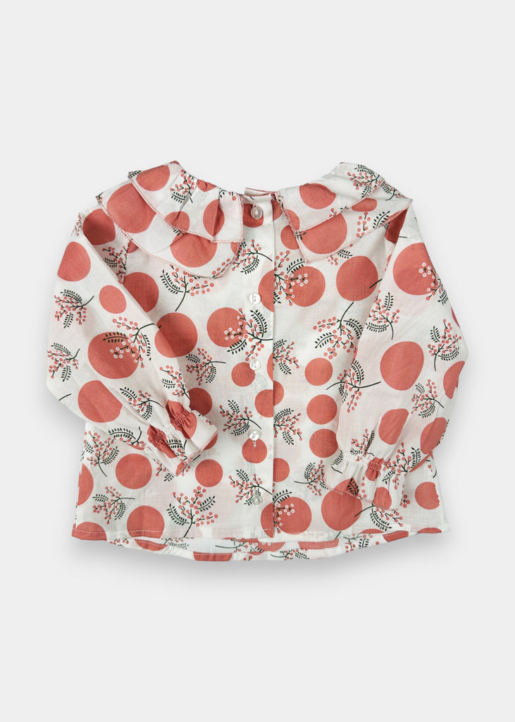 Camicia in 100% cotone con colletto doppia rouches e bottoni sul retro.