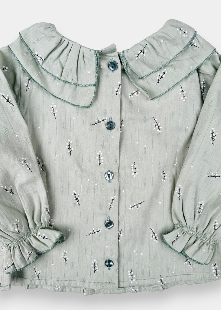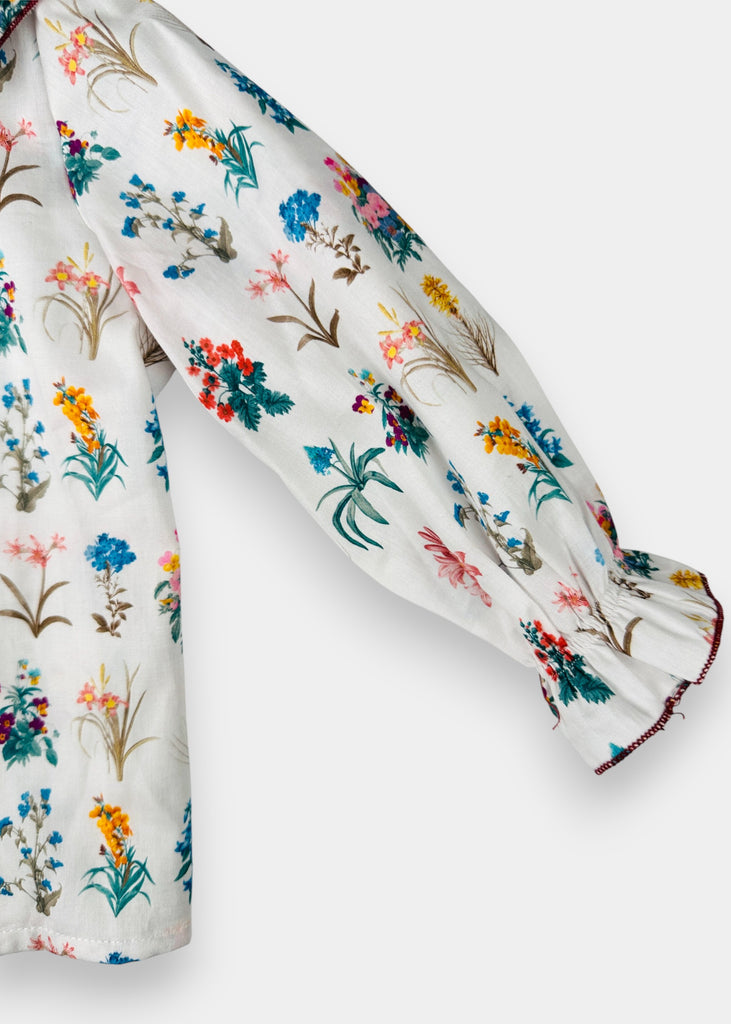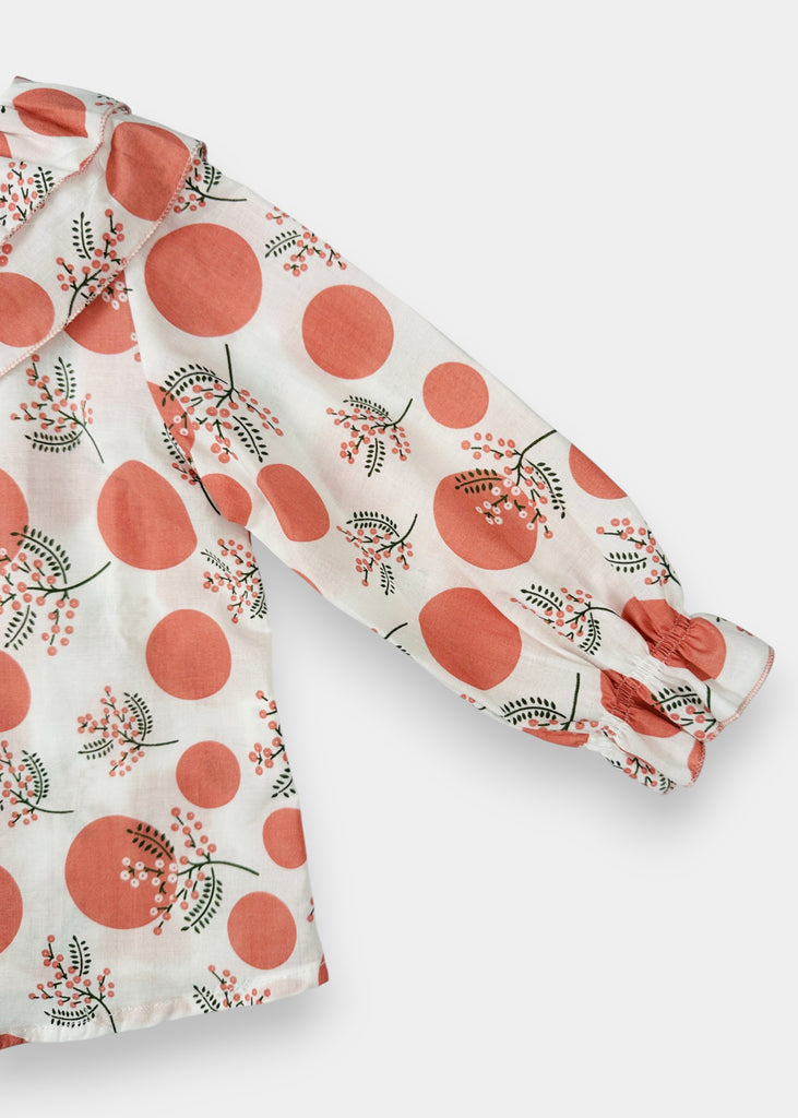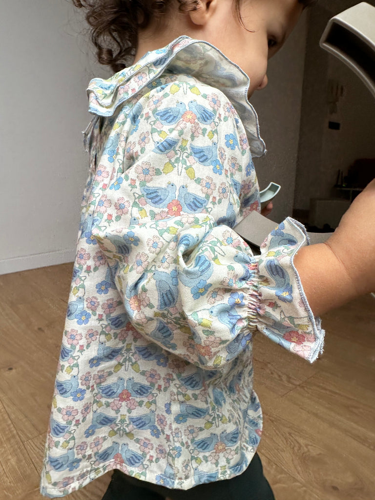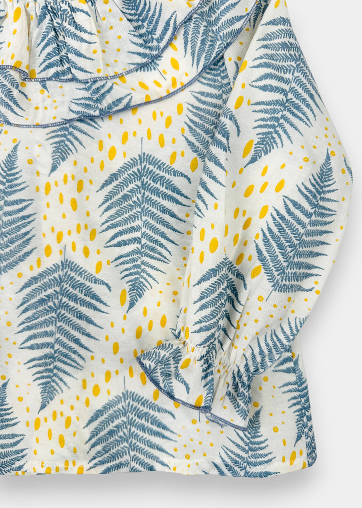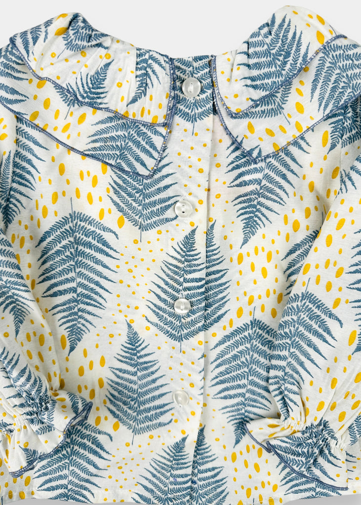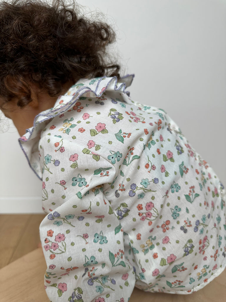Camicia in 100% cotone con colletto doppia rouches e bottoni sul retro.