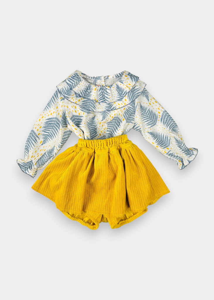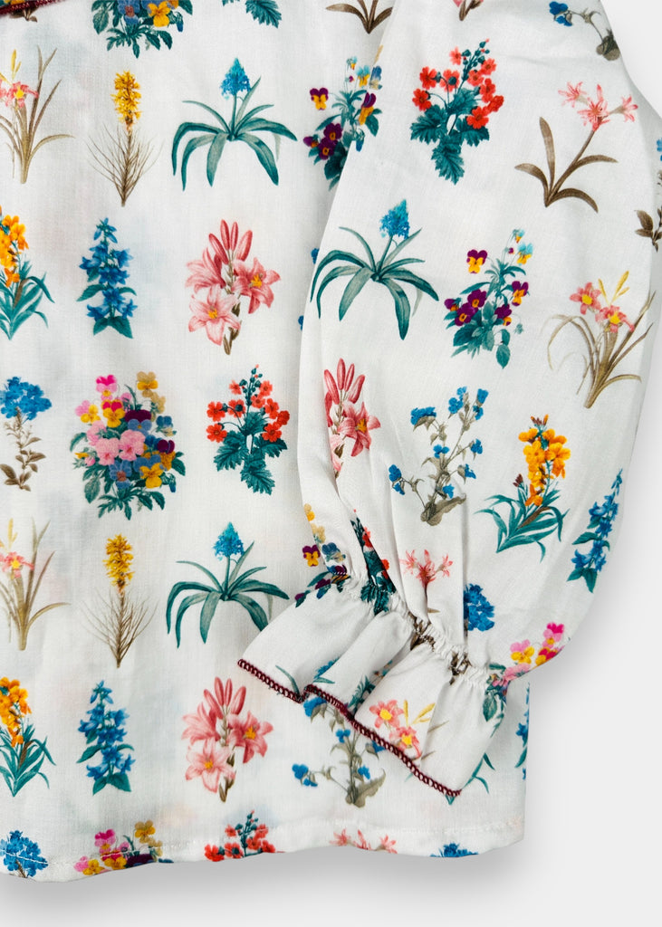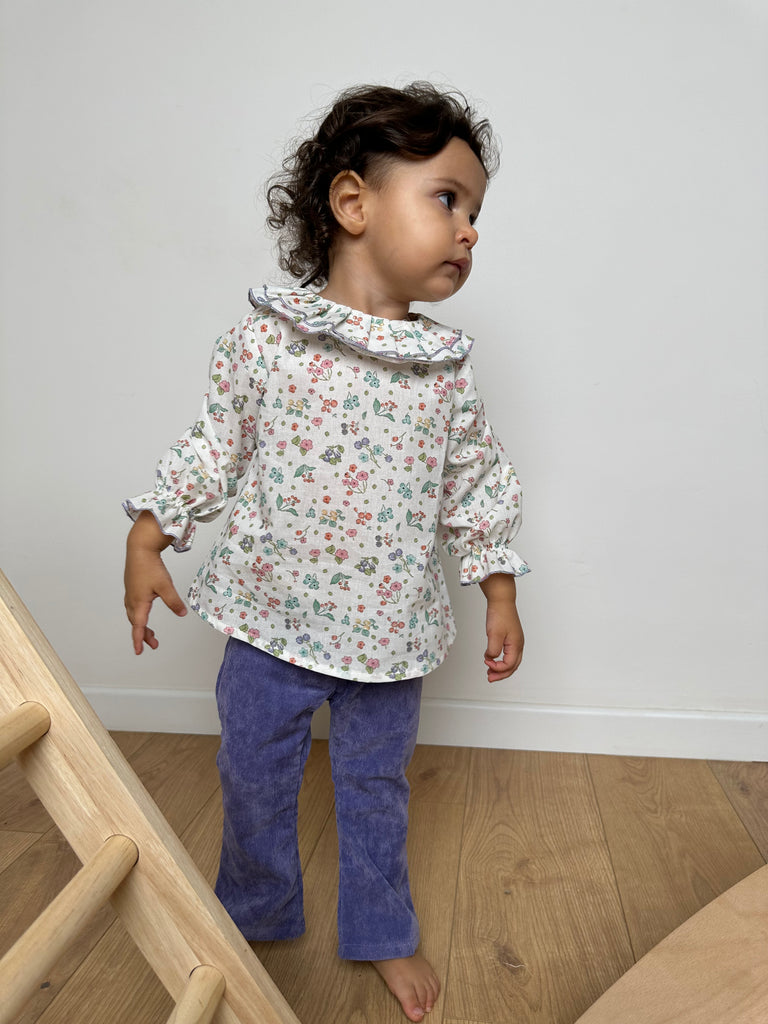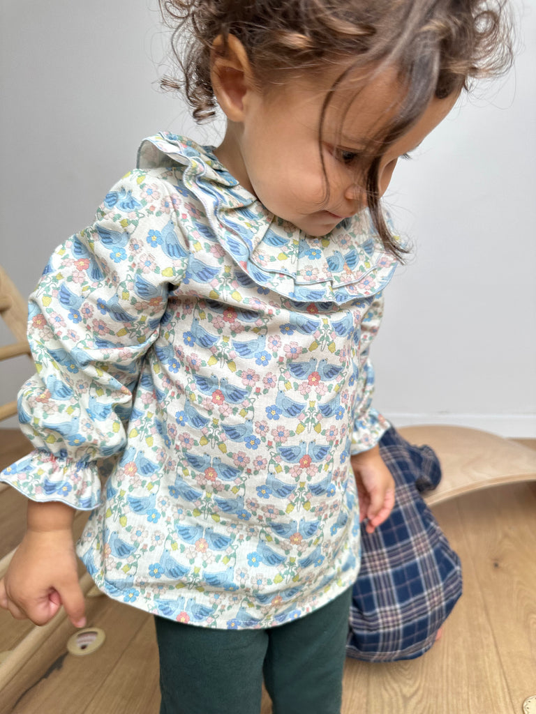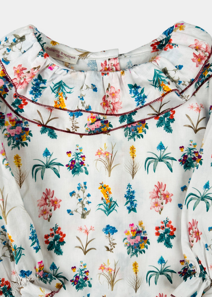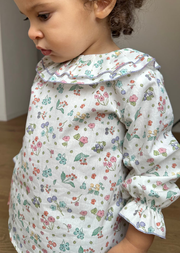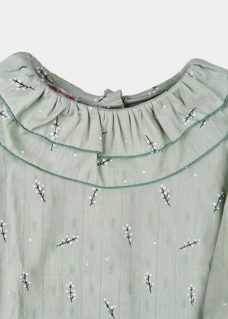 Camicia in 100% cotone con colletto doppia rouches e bottoni sul retro.