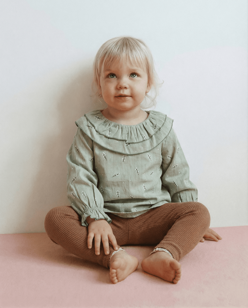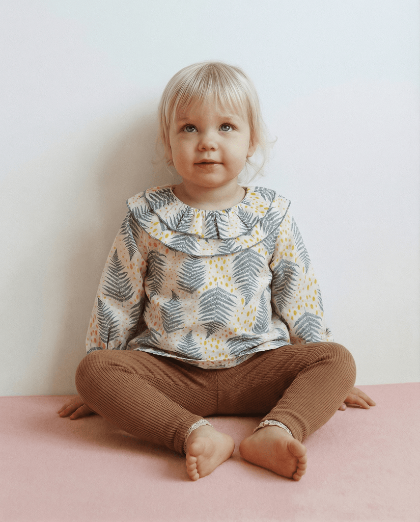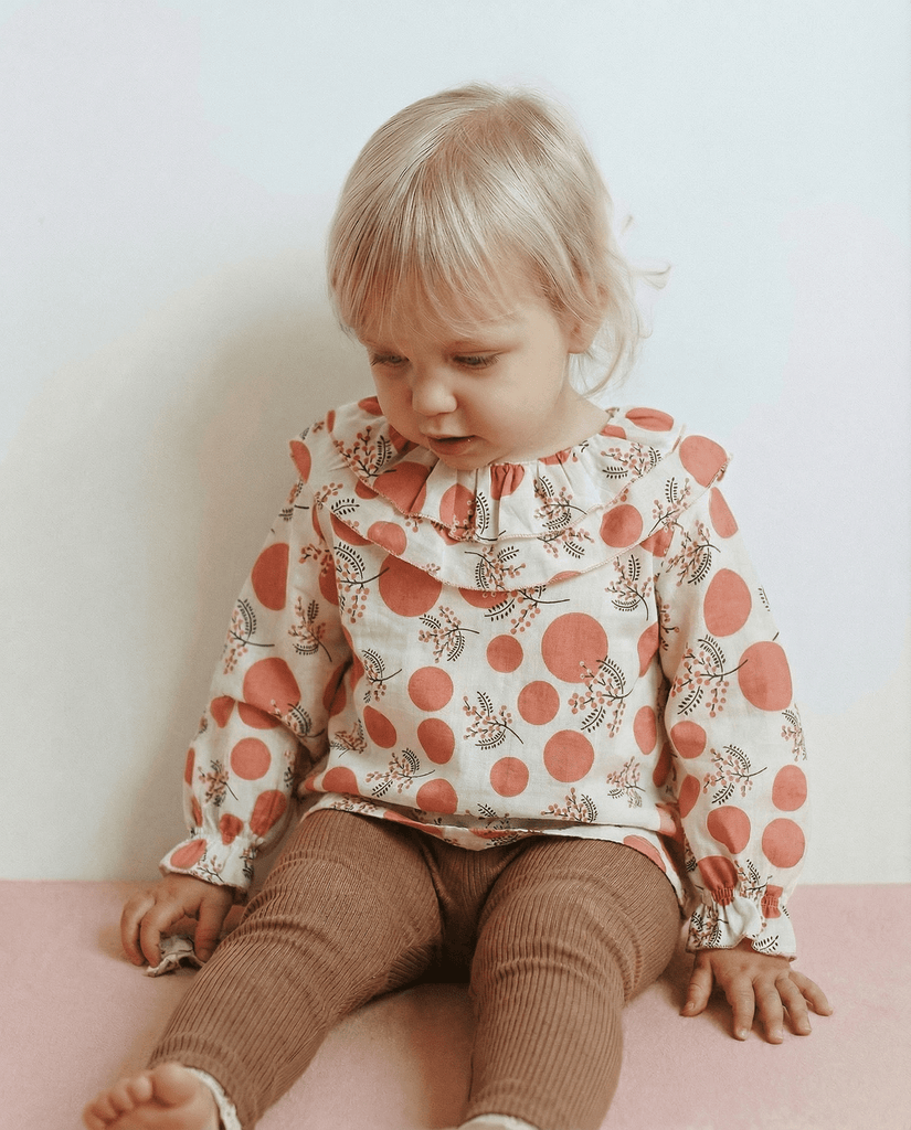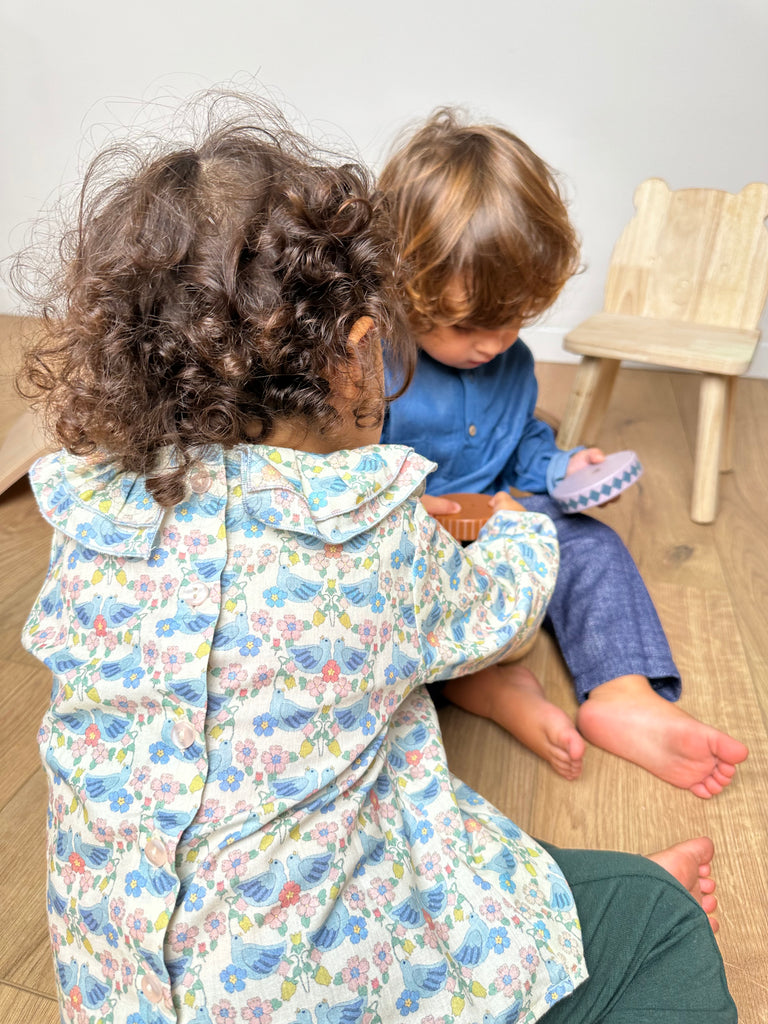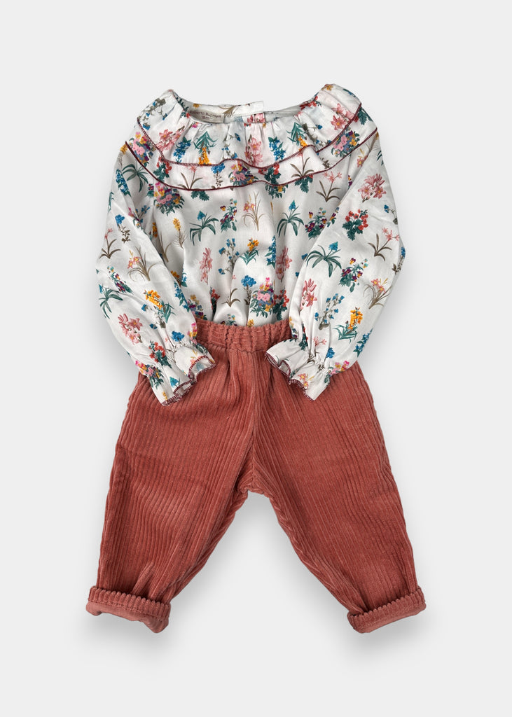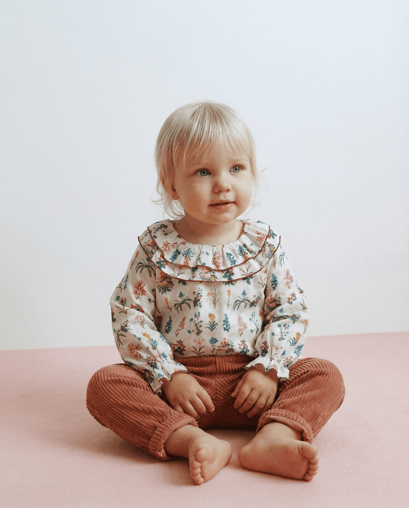 Camicia in 100% cotone con colletto doppia rouches e bottoni sul retro.